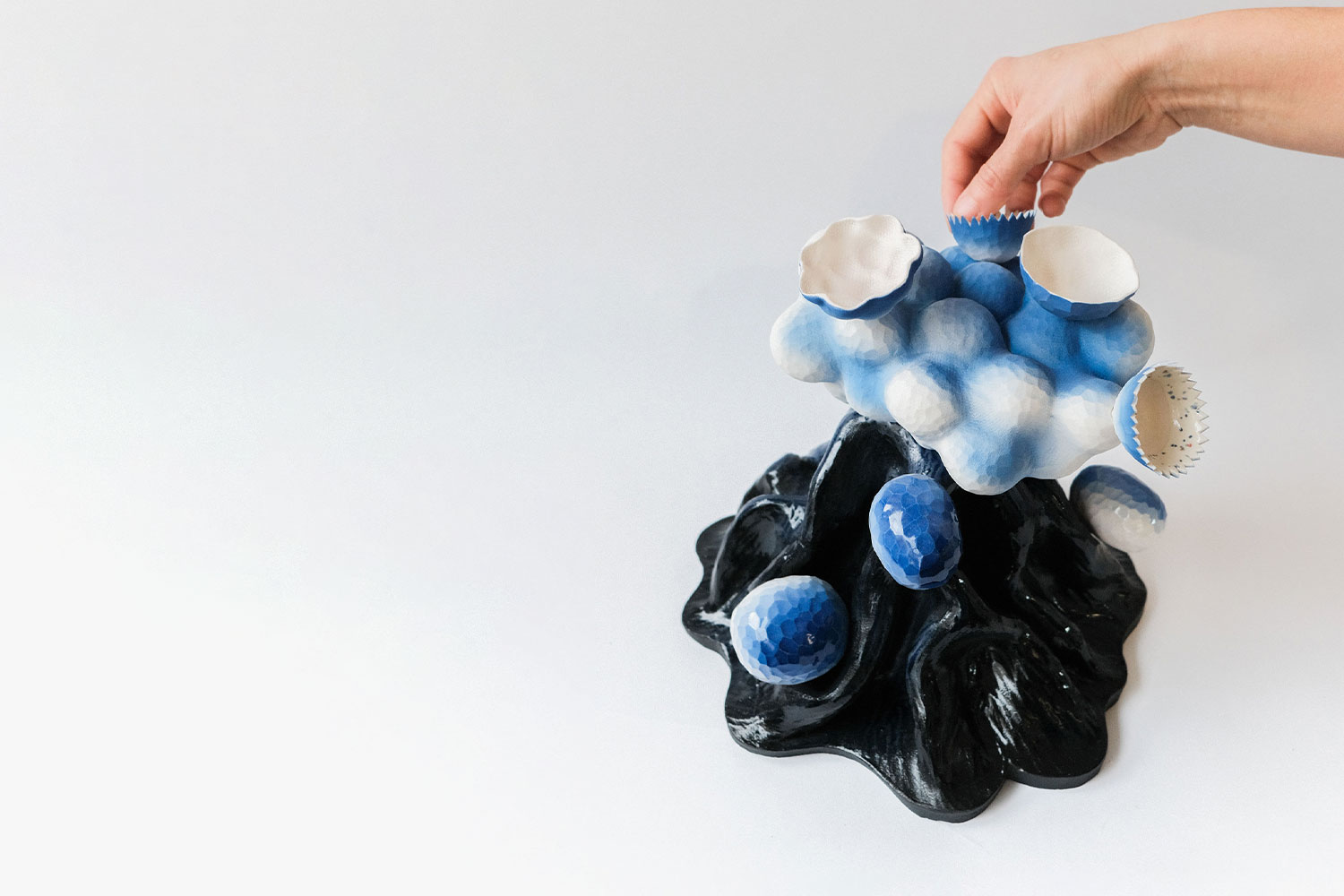 This hand built volcano vase by Kartini Thomas with a cloud emerging from its top opening has a base glazed in a black to cobalt gradient, sits flat on a table and has small holes for attaching decorative elements. The bubbly cloud is painted in a matt blue to white gradient and has tiny facets on its surface. A selection of decorative attachments comes with each sculpture, allowing the owner to change its shape as desired.