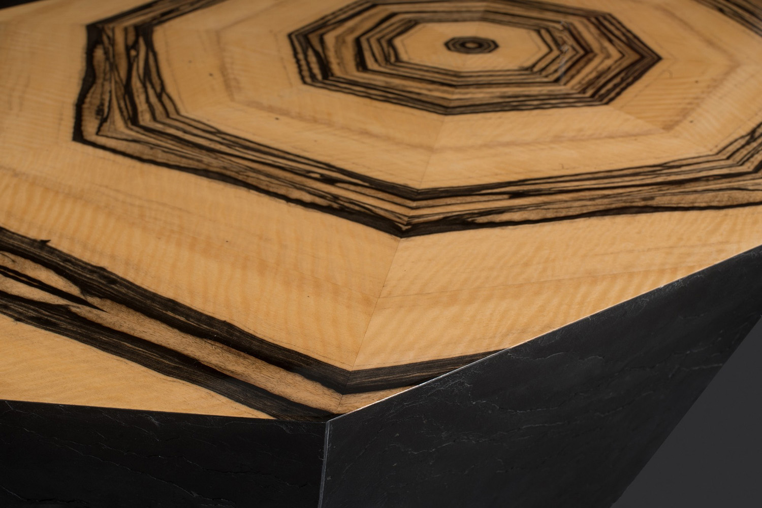 This is a slate stone coffee table with white ebony veneer from Laos, giving a surreal result. The marquetry is worked up in sun curling, and finished with a glossy varnish. The slate stone veneer on the raw side is simply oiled.