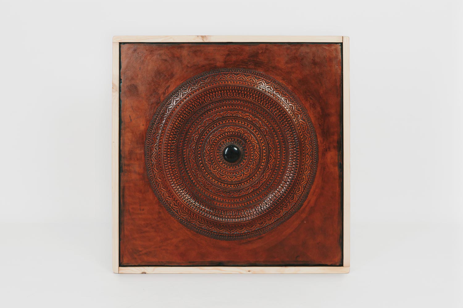 This wall piece is made of vegetable tanned cowhide leather on a wooden base. The surface was stamped by hand with cold stamping iron dies. Engravings are highlighted in black while the colour of the overall piece is cognac. The leather has a mineral, black tourmaline set in the centre.