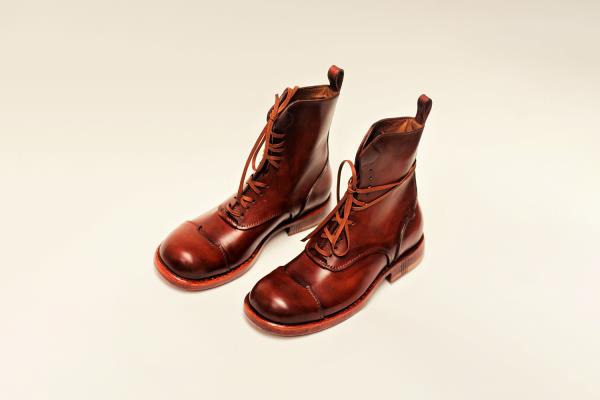These Oxford style men's, formal lace-up shoes are made of genuine stiff black leather with a smooth shiny texture. The shoe last and patterns are individually made after the sketch, which is the first step in designing the boot. Both the leather and lining are hand-cut. The perforated patterns on the toecap and sides, as well as the overall slender contour, add a stylish look to the shoe.