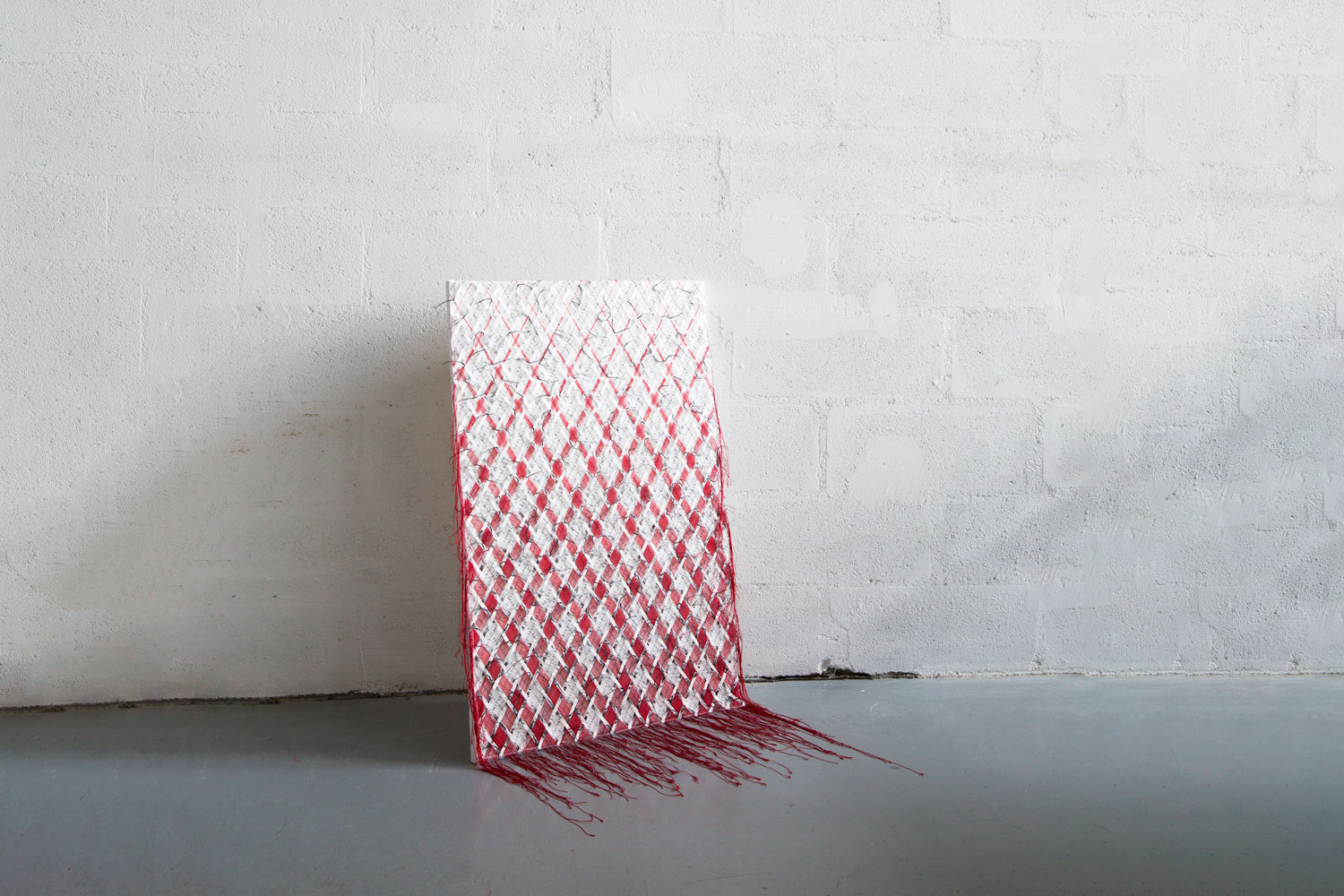 This needle embroidery, is created with red pearl silk, white paint and graphite on a white organza fabric.