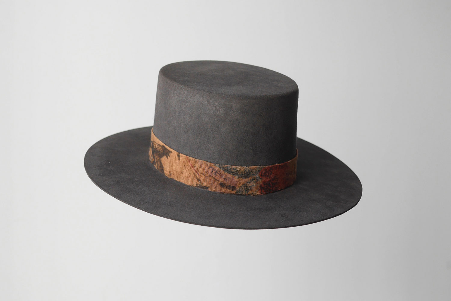 Bakuri is an anthracite cordobés hat with a trimming made from vintage woolen fabric from Italy. This is Maleza's attempt to design a more “urban” cordobés, eliminating the classic grosgrain ribbon and shortening the brim. This hat is made from upcycled felt. The interior is lined with homemade orange clay satin, hand stamped with a hot foil rosemary branch and black leather sweatband, sewn in by hand.