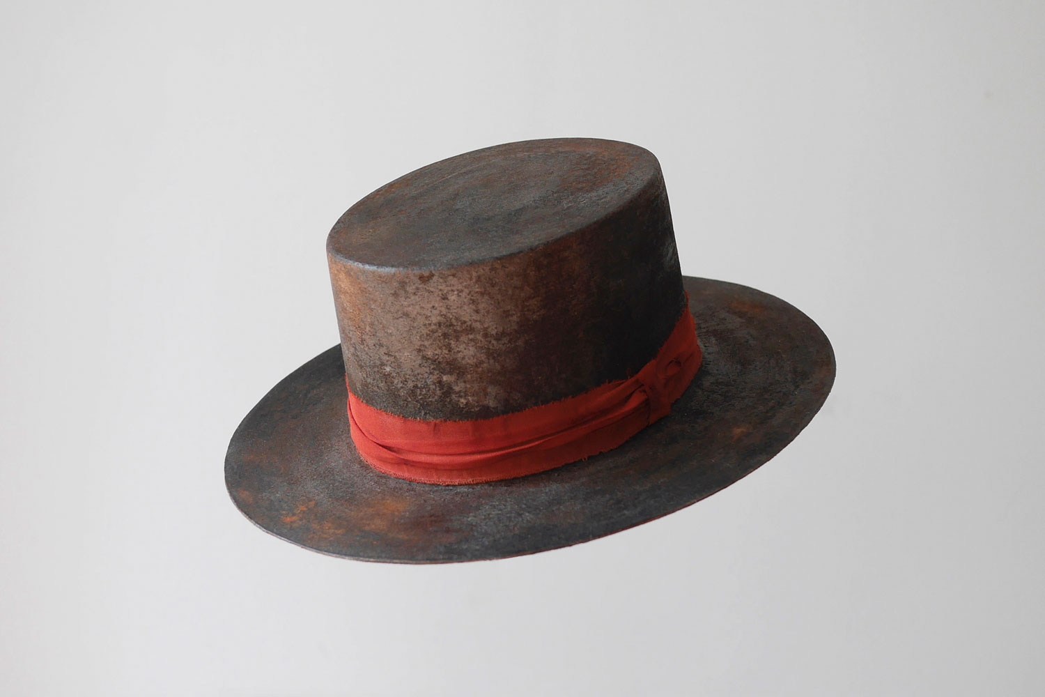 The colour of this flat crown cordobés tries to imitate the colour of rusty iron. The hat is handcrafted from upcycled felt and the trimming from distressed orange fabric. Tacande means "scorched earth" in Guanche, an extinct language that was spoken by the first known inhabitants of the Canary Islands. This hat is Maleza's personal memory of the adventures living there, surrounded by the dark quietness of the unpredictable volcanoes.