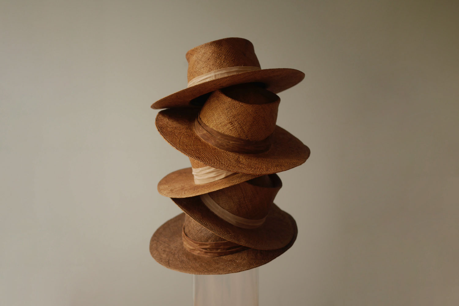 Lua, Hawaiian for crater, is an attempt to create a summer hat that matches almost any face. The hat is made from bao, fibres of the baobab tree, hand dyed with rubia tinctorum and nogalina. The trimming is made from recycled Tencel. Because Maleza dye their materials themselves, every Lua is different, varying in colour from light yellow to reddish brown. The trimming is treated in order to achieve a waxed and wrinkled finish characteristic to Maleza's creations.
