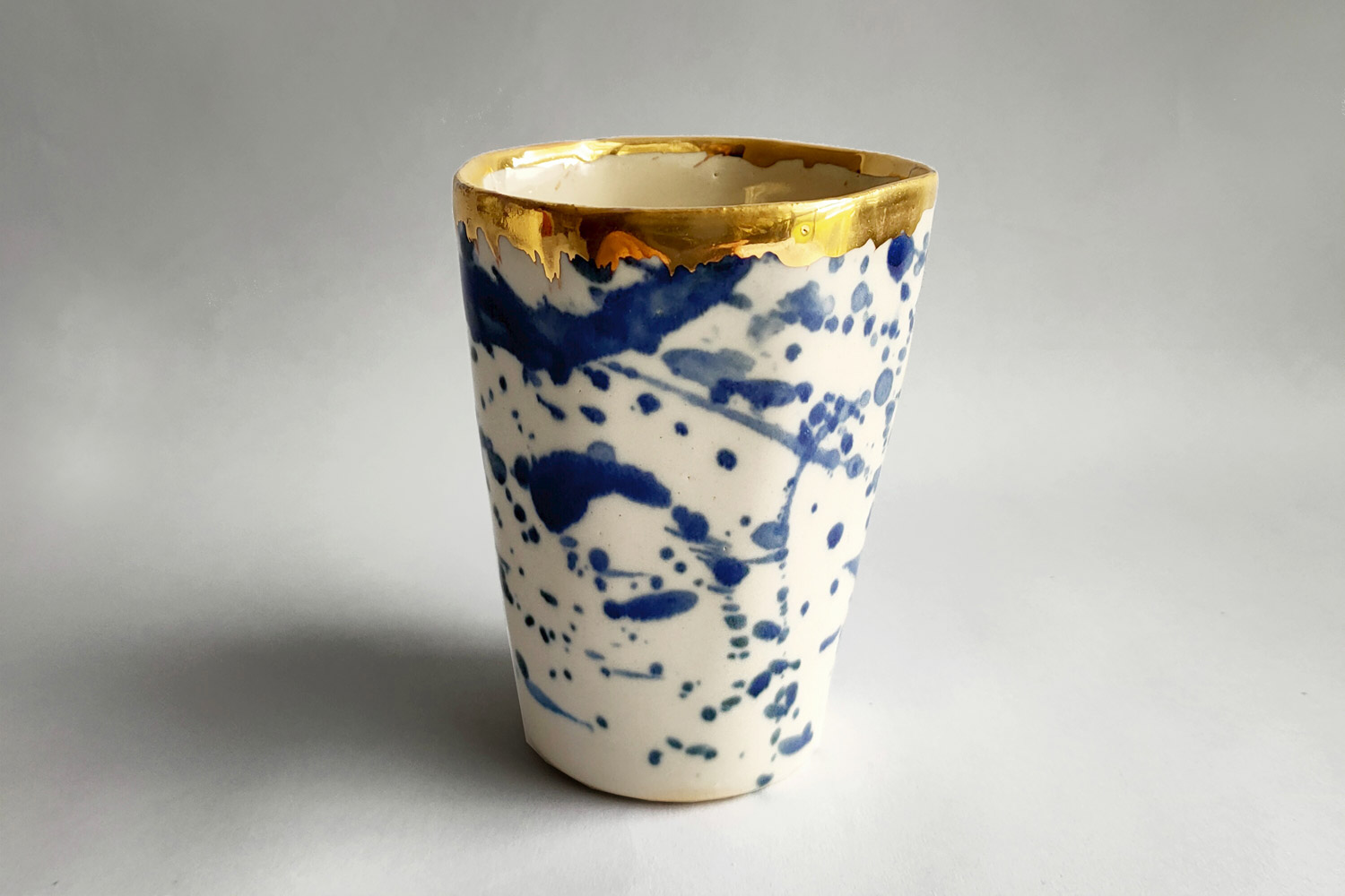 Each hexagonal glass is individually handcrafted and hand painted making no two pieces alike. It is decorated with brushstroke blue cobalt colour with a hand painted gold edge. It is made with white stoneware, decorated in ecru and after a shiny and transparent glaze.