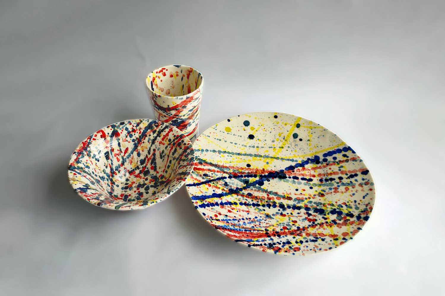 Each piece of this colourful dinner set is handcrafted and hand painted making no two pieces alike. The three pieces, the glass, the bowl and the plate have irregular shapes and are decorated with different coloured brushstrokes. It is made with stoneware and decorated in ecru and finally a shiny and transparent glaze.