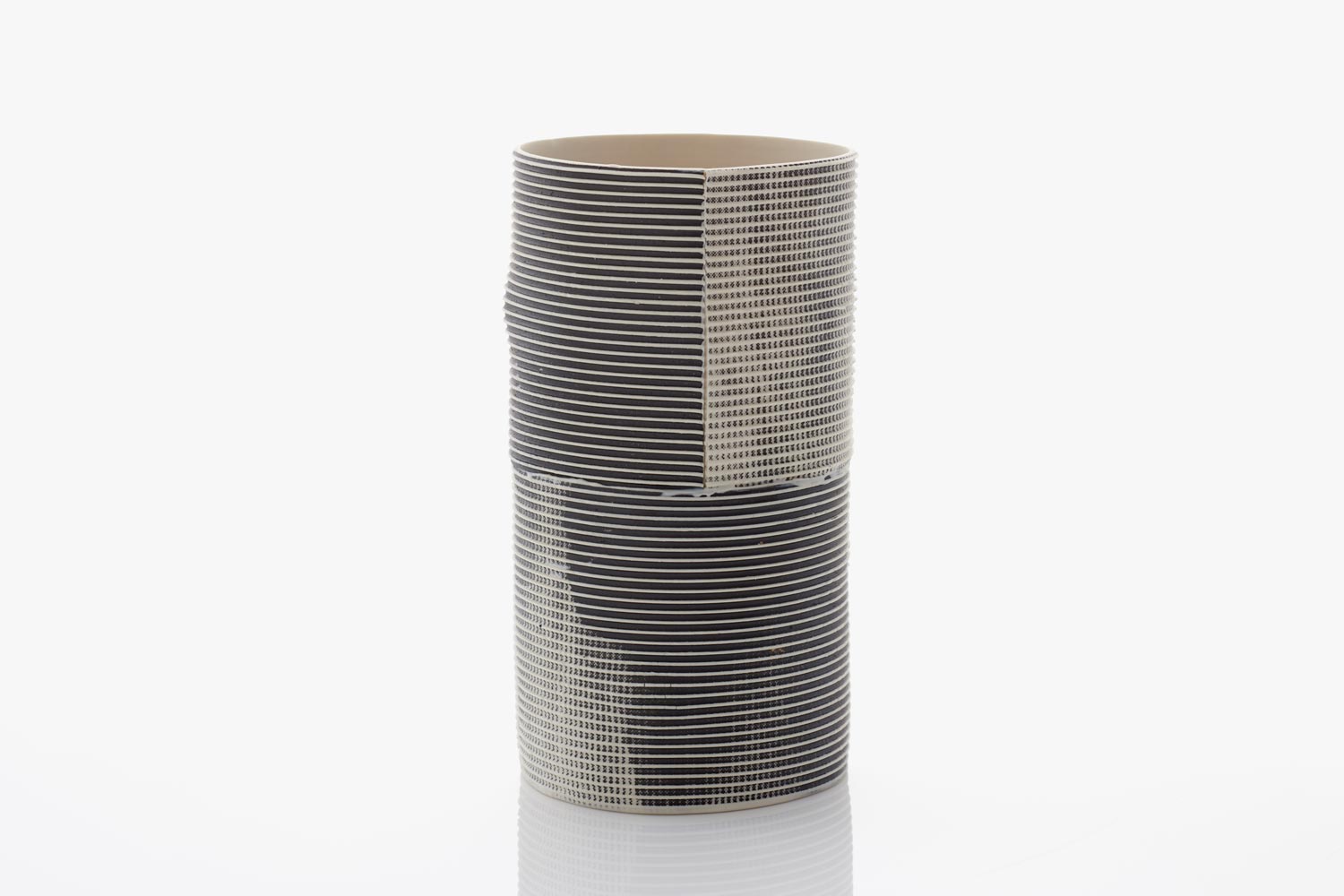 Helen's signature ‘lenticular, moiré ceramic' style - ‘shifting and moving surface effects' - is created by using stained black clay screen printed onto plaster batts, contrasting with white porcelain casting slip. By forming a textured, wafer-thin sheet of clay into an upright, oval cylinder and attaching a base, the translucency of the material enables light to shine through the vessel's wall.