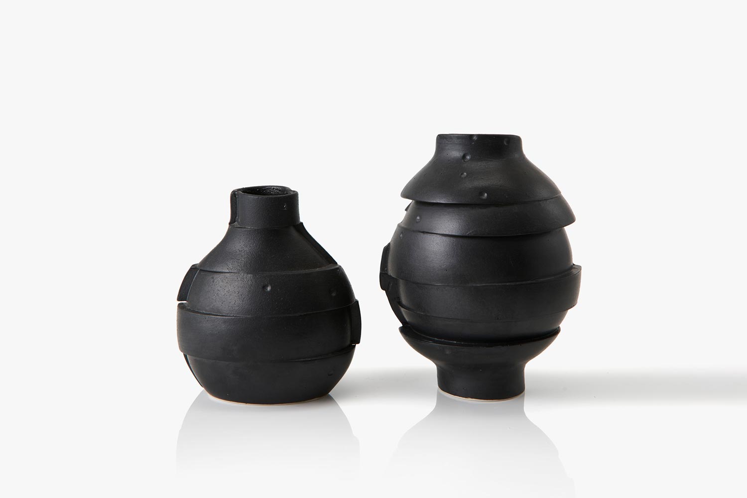These distorted traditional vase forms in a brutalist style were Bisque fired and glazed. Plaster moulds were made from a vase that had been sawn up, re-assembled, then secured before porcelain casting slip was poured in to create the new shapes. When set, the mould is removed, any imperfection is highlighted with surface pattern.