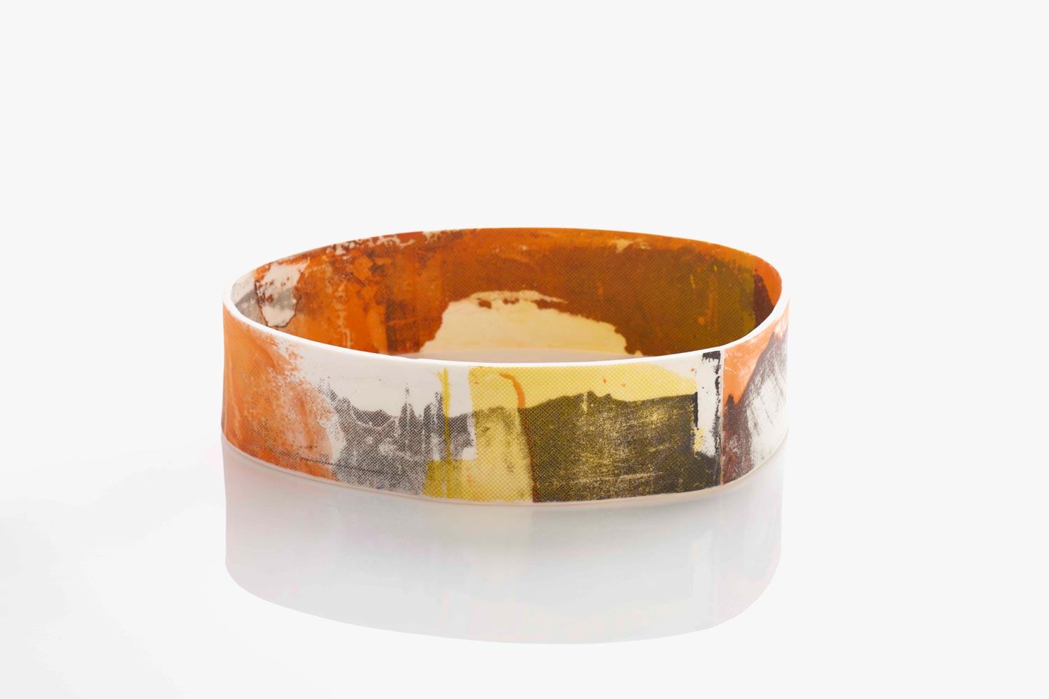 Using the colours of orange, yellow, black and white, Helen screen printed clay onto a plaster batt. An A3 sheet of porcelain is cast, carefully removed from the plaster, cut up and laminated together to make double-sided vessel walls, before cutting to size and joining. A base is attached and smoothed to create a low, wide contemporary and decorative ceramic object, reminiscent of an abstract desert.