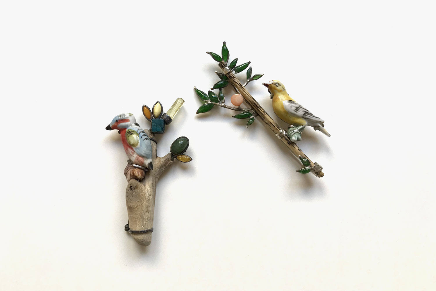 These matching brooches are made up of two fantastic twigs on which ceramic birds sit. The design was born from observing a similar scene in nature. The multi-coloured stones beads highlight the brooch's composition.