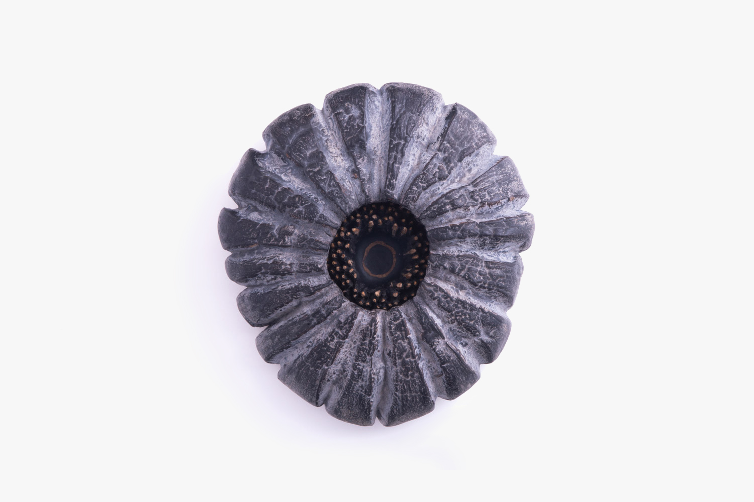 There are many aspects of this brooch that impress Angelos Konstantakatos, not least the 94 mm long dehydrated mushroom used as the central mounting piece. Only black was used, although you can also see white, grey and gold. It took one week to make the facade and four weeks to treat it from the back. When you see it in real life, you are sure the material is stone.