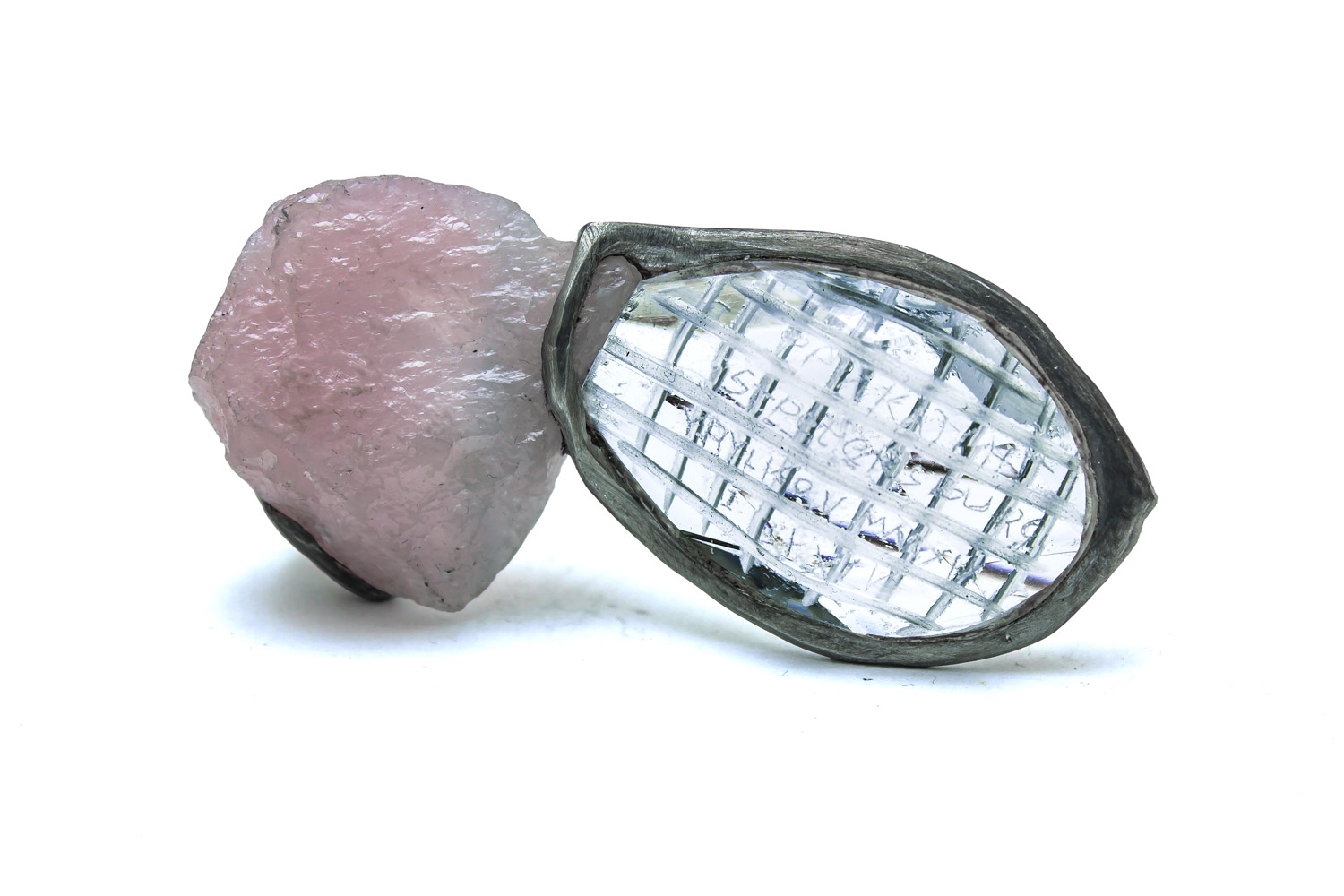 The Pink Island brooch is made of a carved stone, glass and pewter.