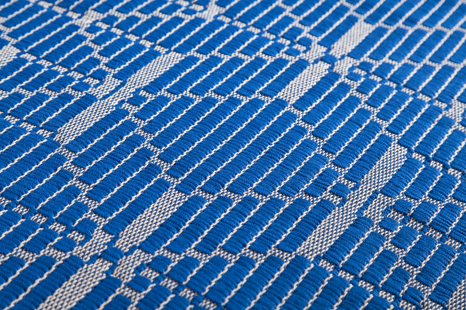 The blue Lanour carpet, handwoven from cotton yarn and cord, features a star pattern on both front and reverse. The star motif is common in folk fabrics. The use of white contour lines creates a clean surface.