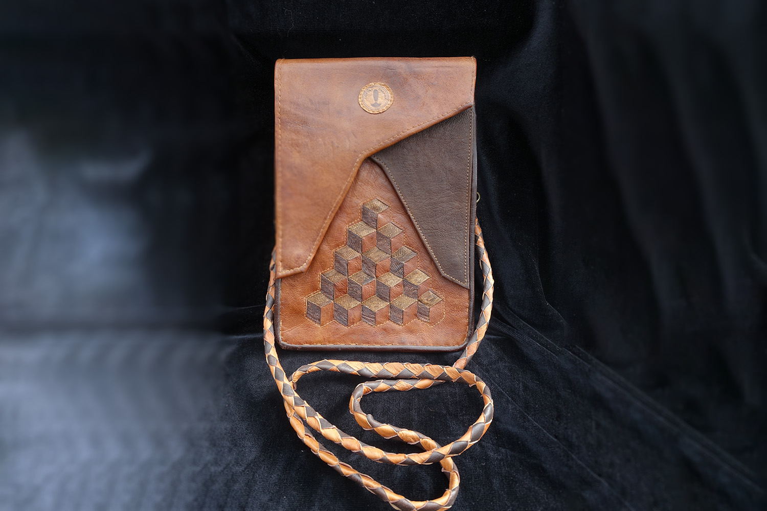 This is a rectangular shoulder bag sewn from light and dark brown bark-tanned cowhide. The bag has a two-piece lid that closes with magnets. The front has a three-dimensional pattern created by strips of bark-tanned burbot skin in different shades.