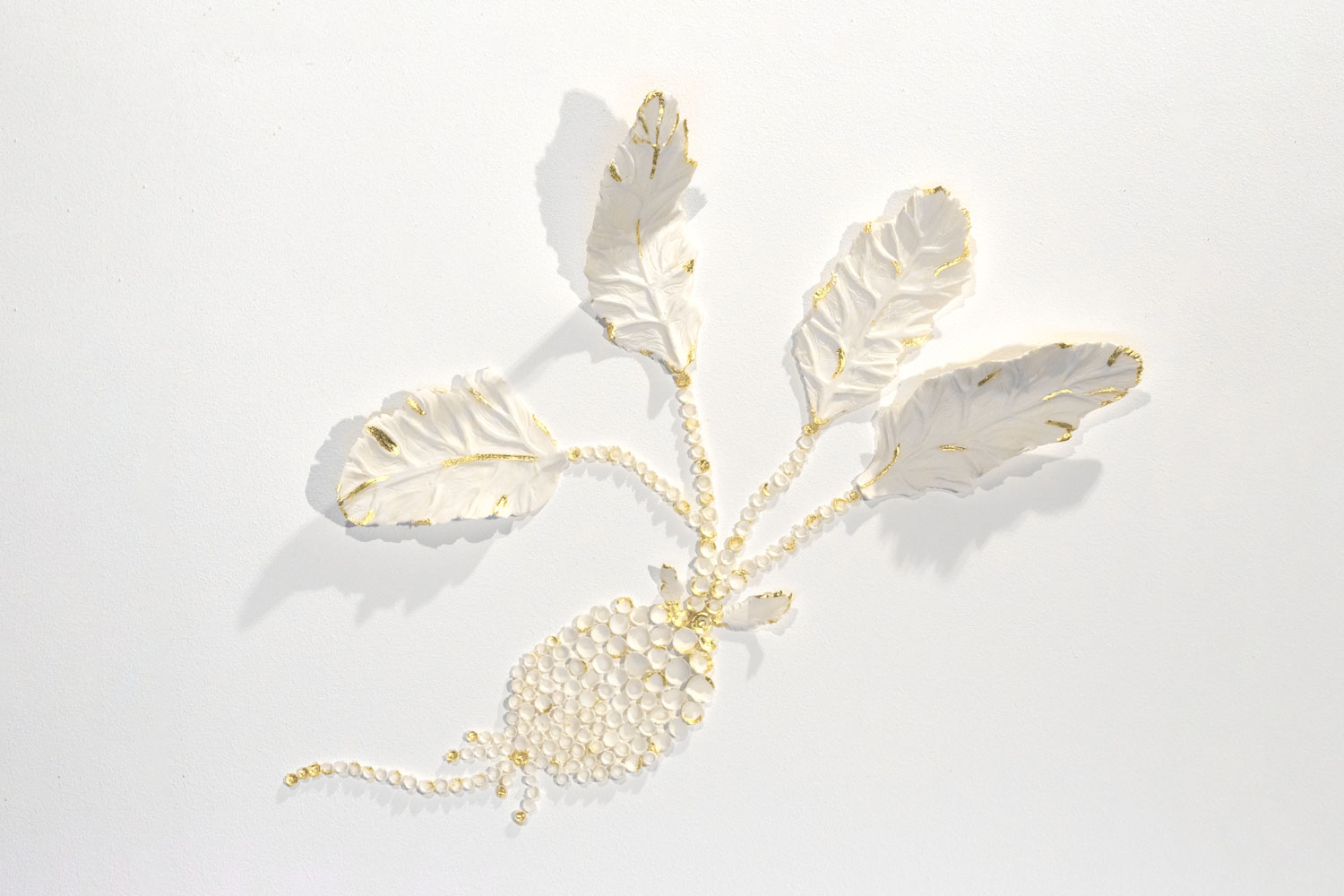 White wood panel adorned with matte white porcelain foliage. Some parts of the work are lightly gilded.