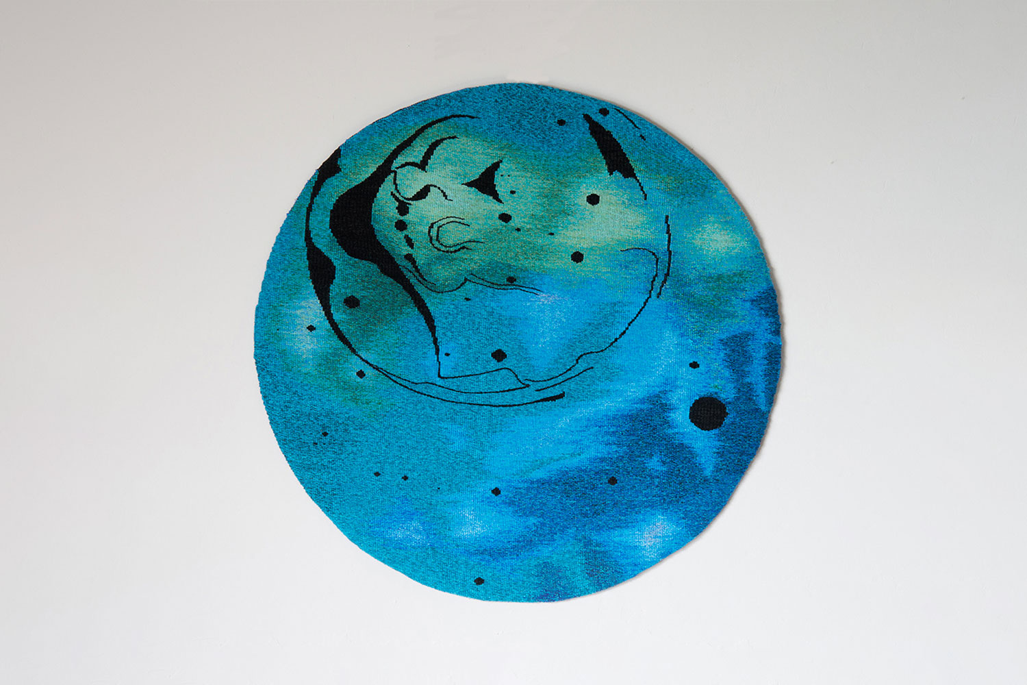 This tapestry is completely handwoven. Margaret Jones devised the design in such a way that each viewer may interpret the colours and shapes as they wish. Sometimes they see the sea and manta rays, and sometimes nebulae from outer space.