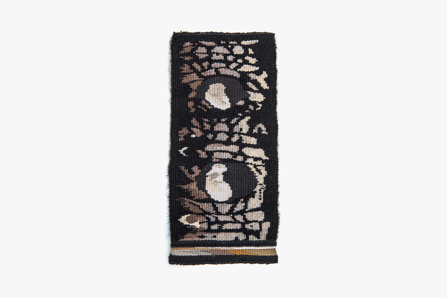 Margaret Jones stumbled across a hawk moth caterpillar in her garden and thought the markings were so amazing she just had to reproduce them. This handcrafted tapestry is woven in black wool, mirroring the dense velvety black of the caterpillar, while its coloured markings are in silk, giving a three-dimensional effect.