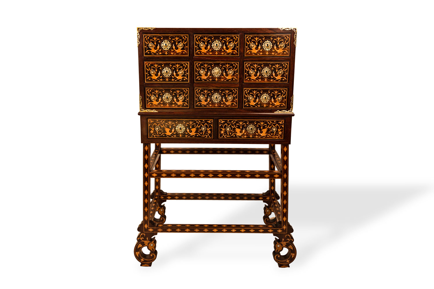 This handcrafted wooden cabinet, made up of a box and trivet, appears to have 11 drawers, but in reality, there are 10 of different sizes. All the sides are decorated with motifs inspired by figures from Hindu mythology, lions, two-headed eagles, vegetable motifs and hearts invoking the Portuguese soul. The drawers are lined with black velvet and there is a concealed safe.