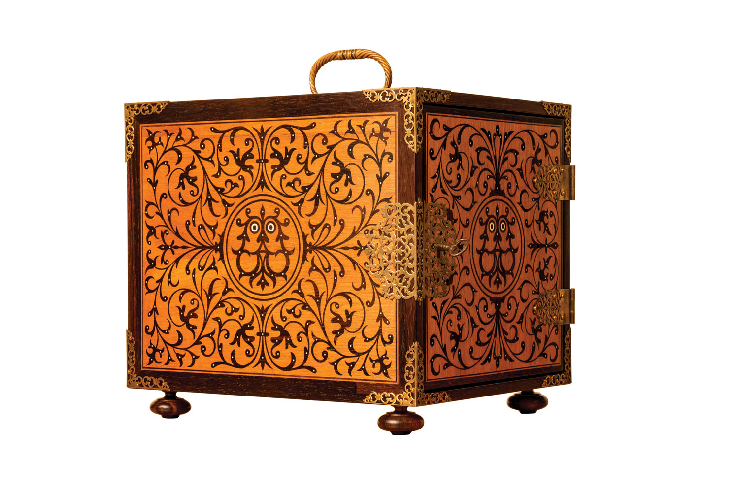 This Indo-Portuguese office box is handcrafted from rosewood and teak wood. The box is inspired from those used by Portuguese travellers, clergymen and navigators, who kept their belongings of great value in them. The door allows all four drawers to be locked at once. The box has been adorned with oriental Goan vegetal and geometric motifs, a tiger's head and gilded brass fittings cut in a very fine lace pattern.