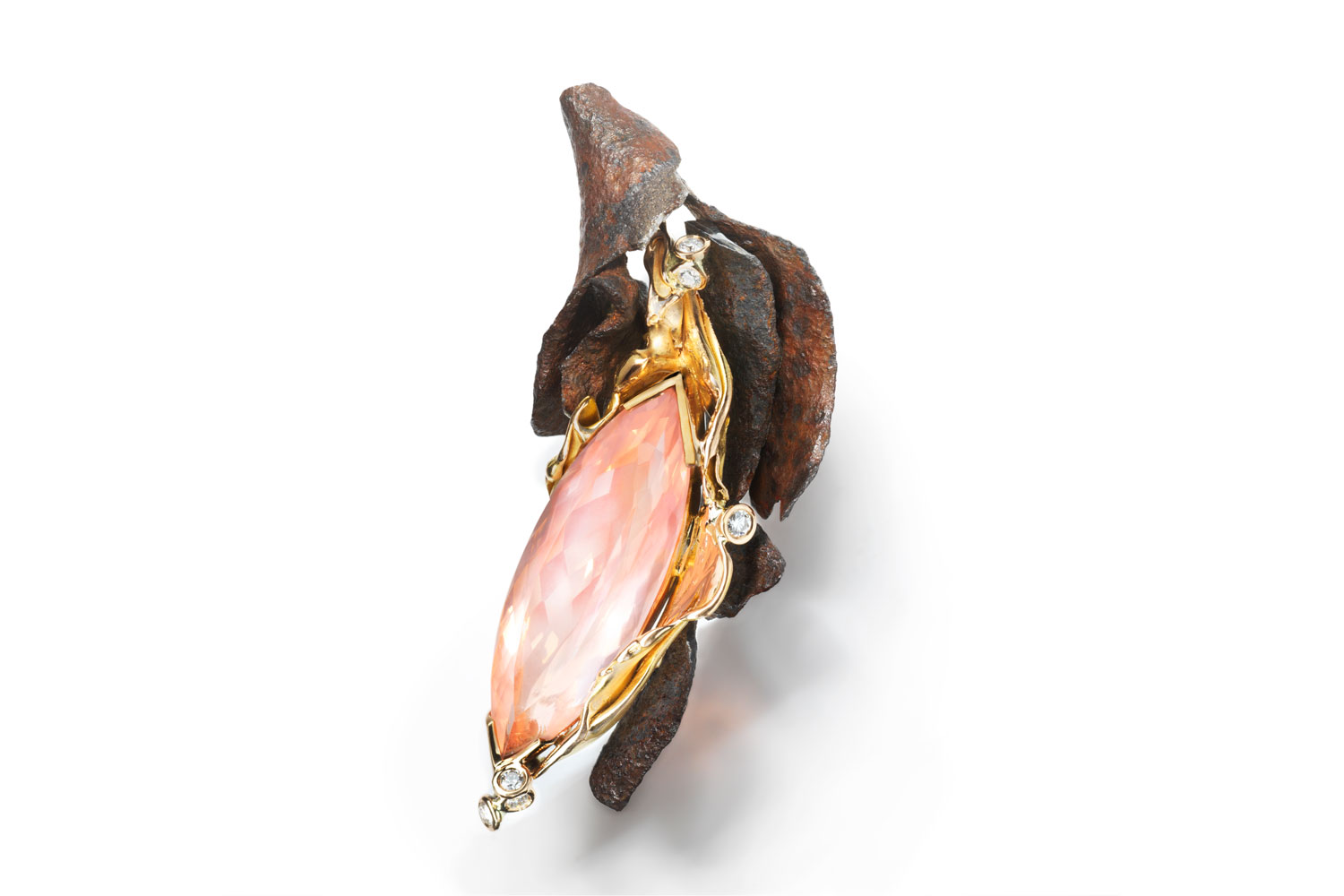 Ring based on rusted steel petals encircling a shuttle-shaped rose quartz in a set of red gold folds. It is punctuated with small diamonds like a voluptuous burst of light opening delicately.