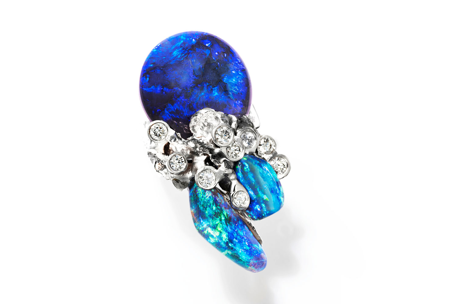 Ring composed of a foam of white gold and diamonds floating in the middle of 3 Australian opals forming a monochrome of phosphorescent oceanic blues.