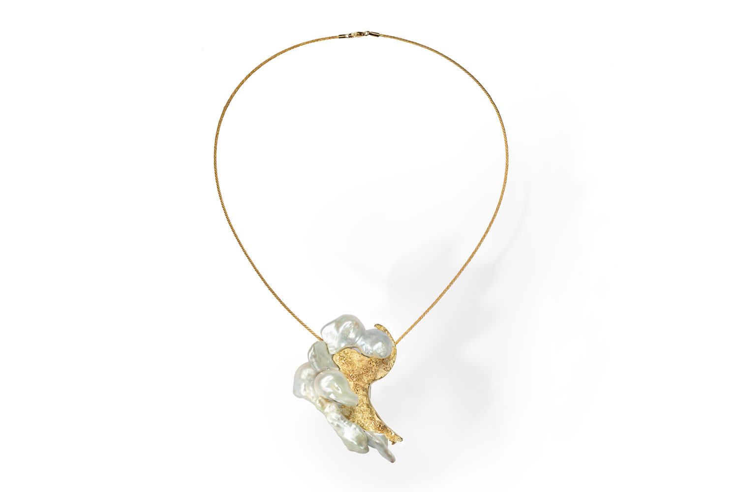 This pendant that can be transformed into a brooch symbolizes a flight of foam composed of white baroque pearls on a golden sandy beach. Gold material is made from micro grains of gold with Thierry's own technique called gold-sand.