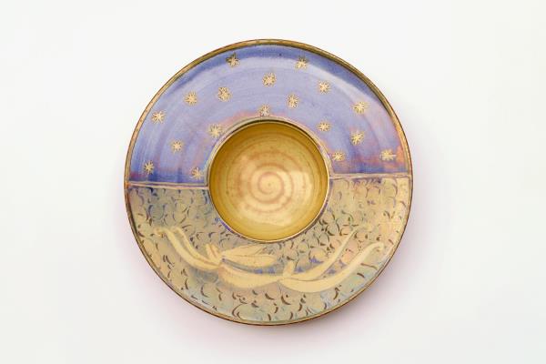A medium sized, earthenware bowl with a flat base and vertical sides, standing on a small foot, painted with a blue ground. Overpainted with golden lustre bands of decoration at the base and rim. Three panels around the centre depict golden leaping hares.