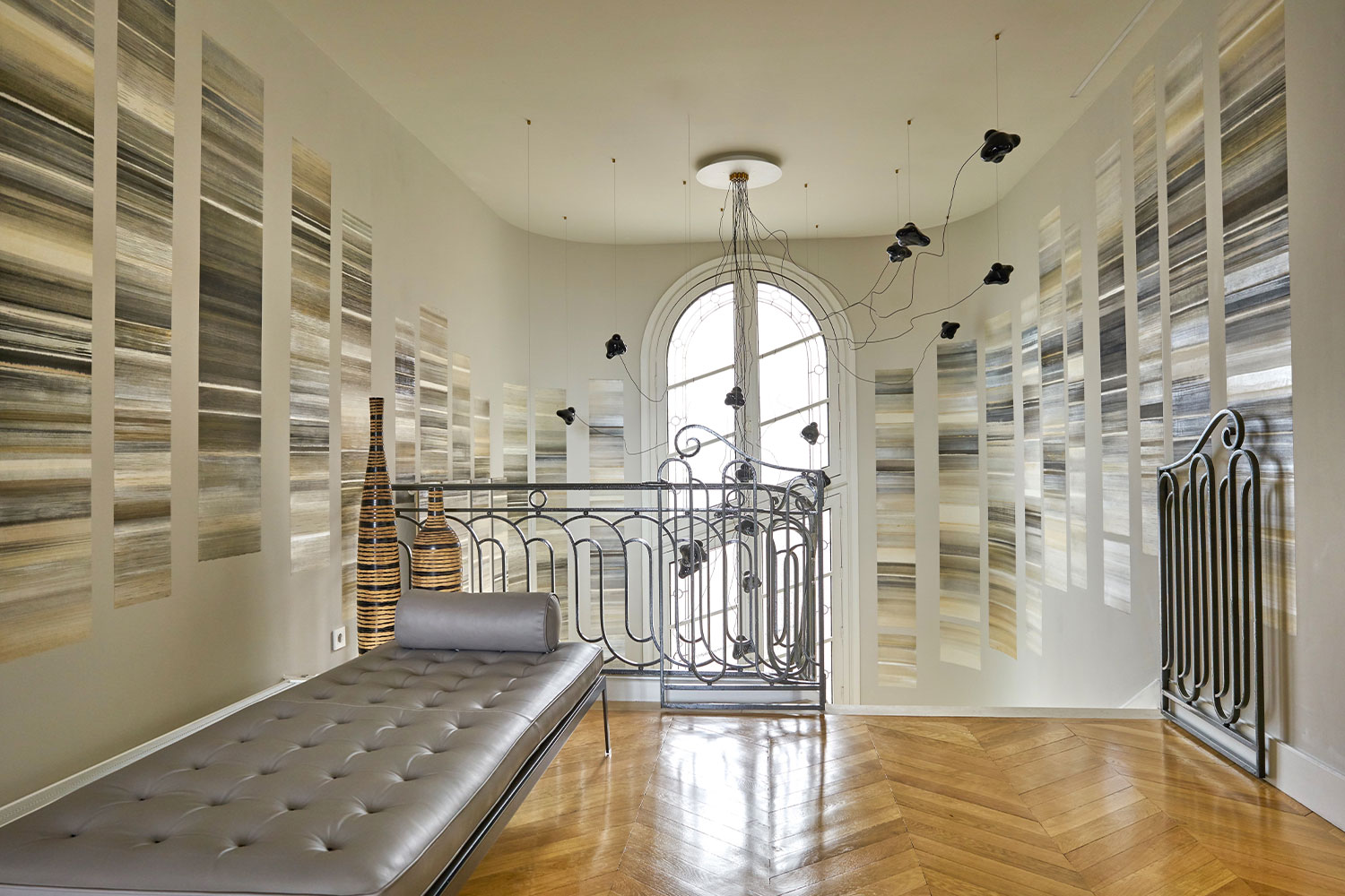 The staircase of this Parisian residence is adorned with 27 handcrafted panels by Caroline Besse. The panels were crafted using powdered tiger eye, calcite, golden grenat and magnetite on Japanese paper.