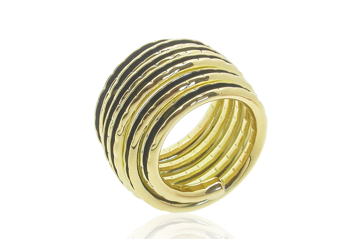 This elegant ring was handcrafted from a single strip of 18k yellow gold. The strip of gold was hand worked, shaping it into a voluminous three-dimensional ring. The colour helps emphasise the depth and curled up feature of the ring.