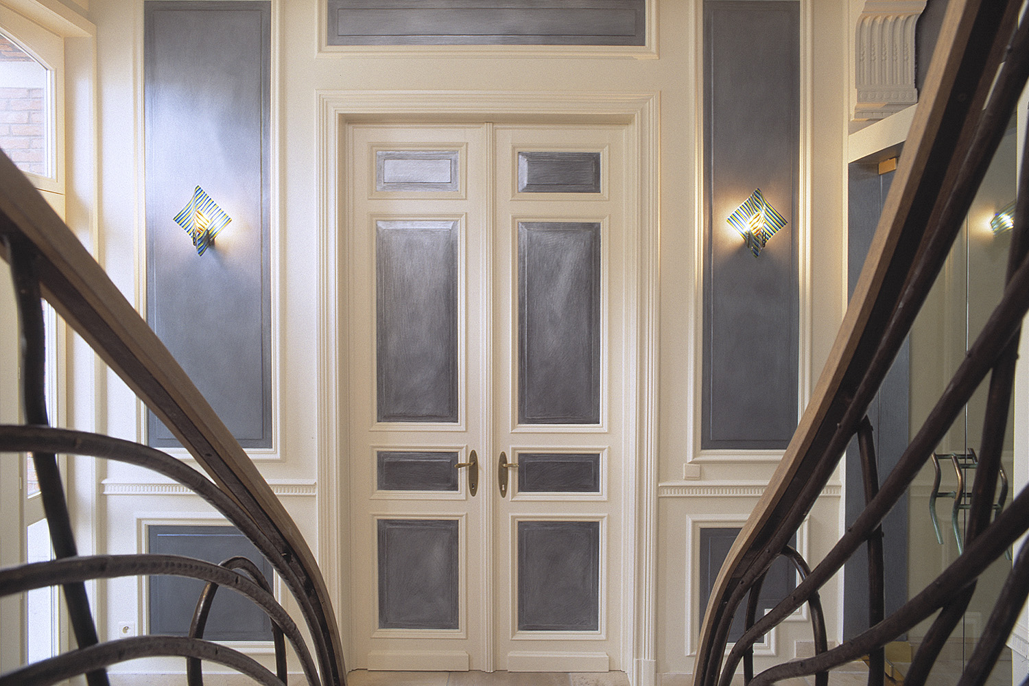 This forged steel staircase was handcrafted for a renovated villa in Brussels. The handrail is made from oak wood. The design is inspired by nature and art nouveau design.
