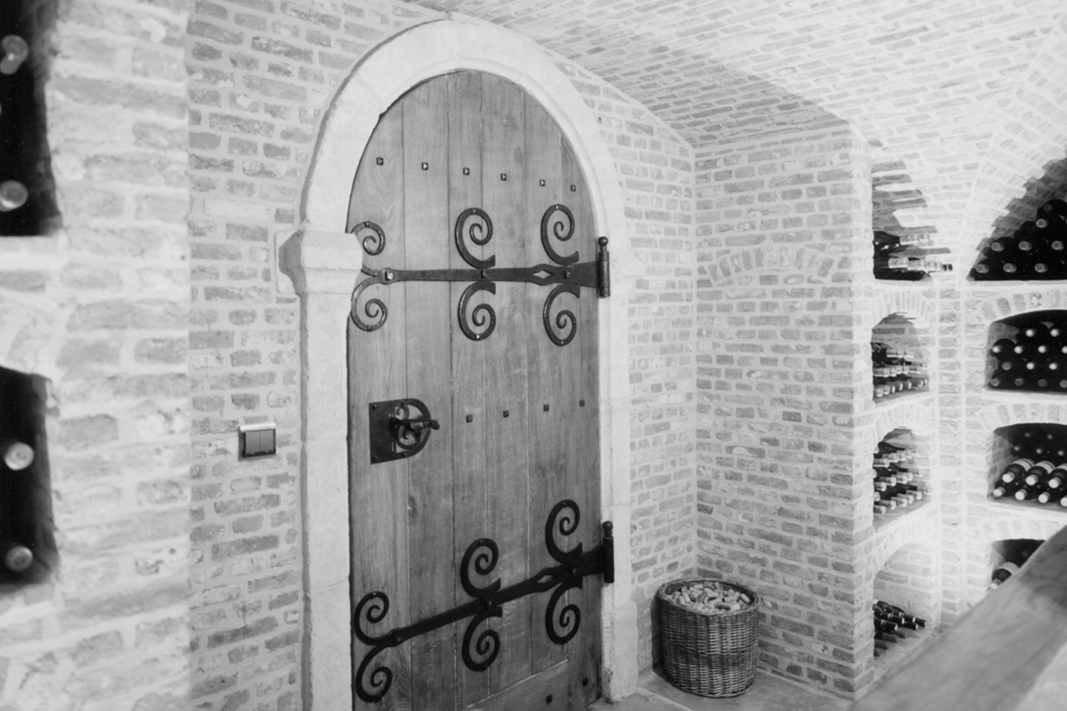 The hinges and nails of this oak wine cellar door are hand-forged steel. They were designed for a renovated villa in Antwerp.
