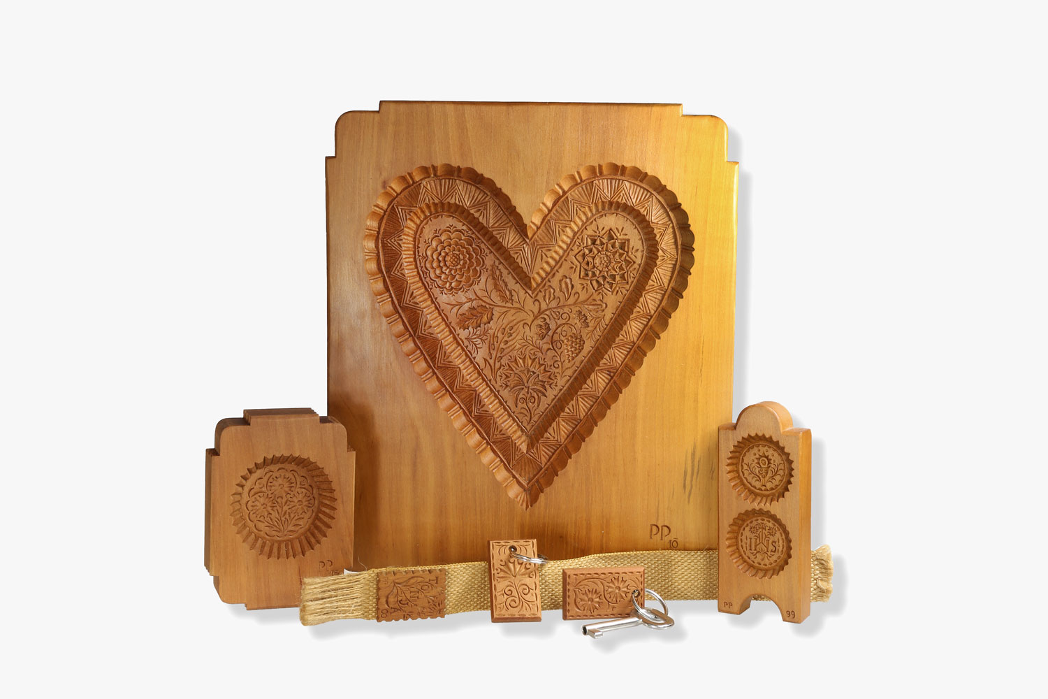 These decorative motifs were hand carved into pear wood. The objects range from moulds for cooking to book indexes and key rings. The carved pieces are finished with a wax coating to protect their surface from their varied uses.