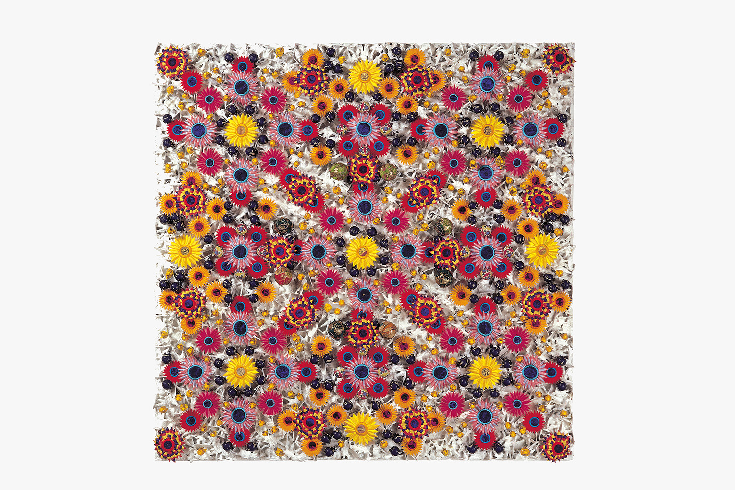 This wall-hung textile, a mixed media assemblage on a wooden panel, was conceived as a flag, where embroidered flowers in yellows, reds, pinks and blues float above 1,000 trapped white toy soldiers. It is a comment on warfare, conflict, entrapment and remembrance.