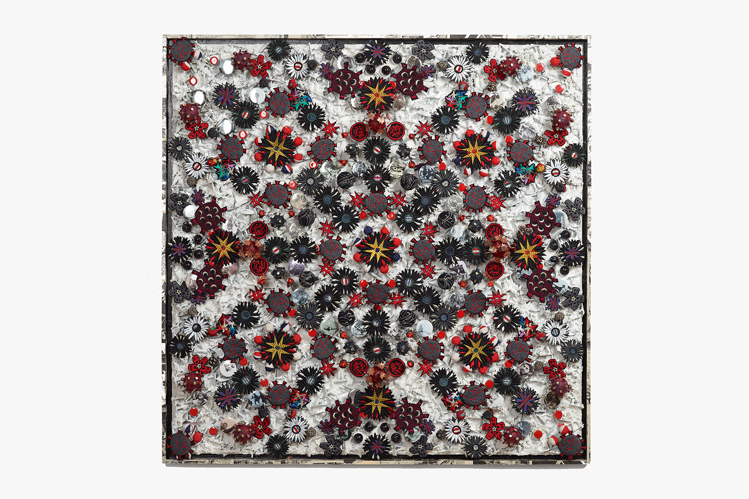 This wall-hung textile, a mixed media assemblage on a wooden panel, possesses strong holographic qualities: as viewers move across the picture plane, they interact physically with the work. Embroidered flowers in reds, blacks and yellows float above the ground of trapped toy soldiers.