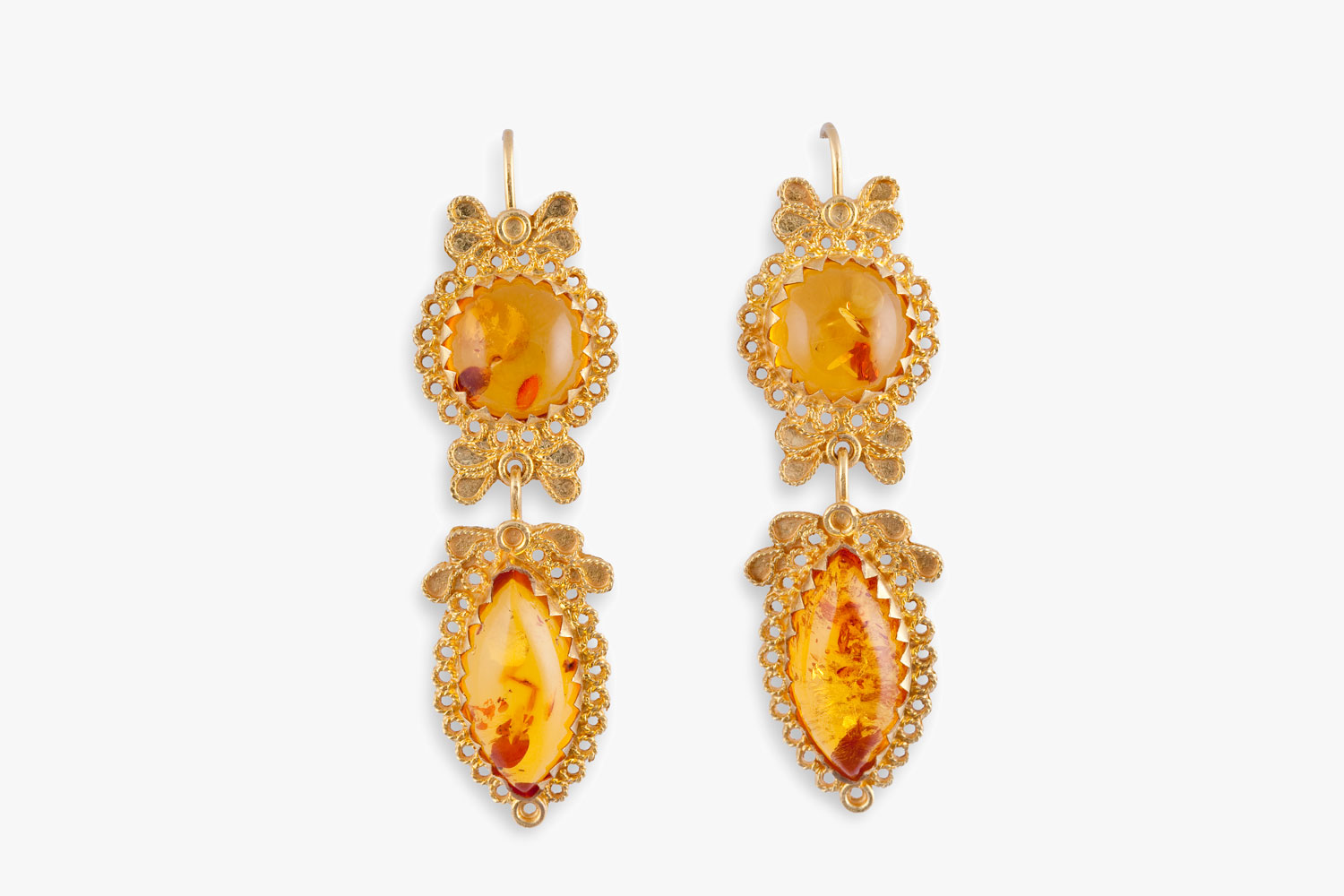 This pair of 18kt gold pendant earrings are crafted from perforated plate and Sardinian filigree, they are formed of two elements. The upper part is in a circular shape with amber set and surrounded by filigree elements and leaves. The lower part is in the shape of a lozenge set with amber.