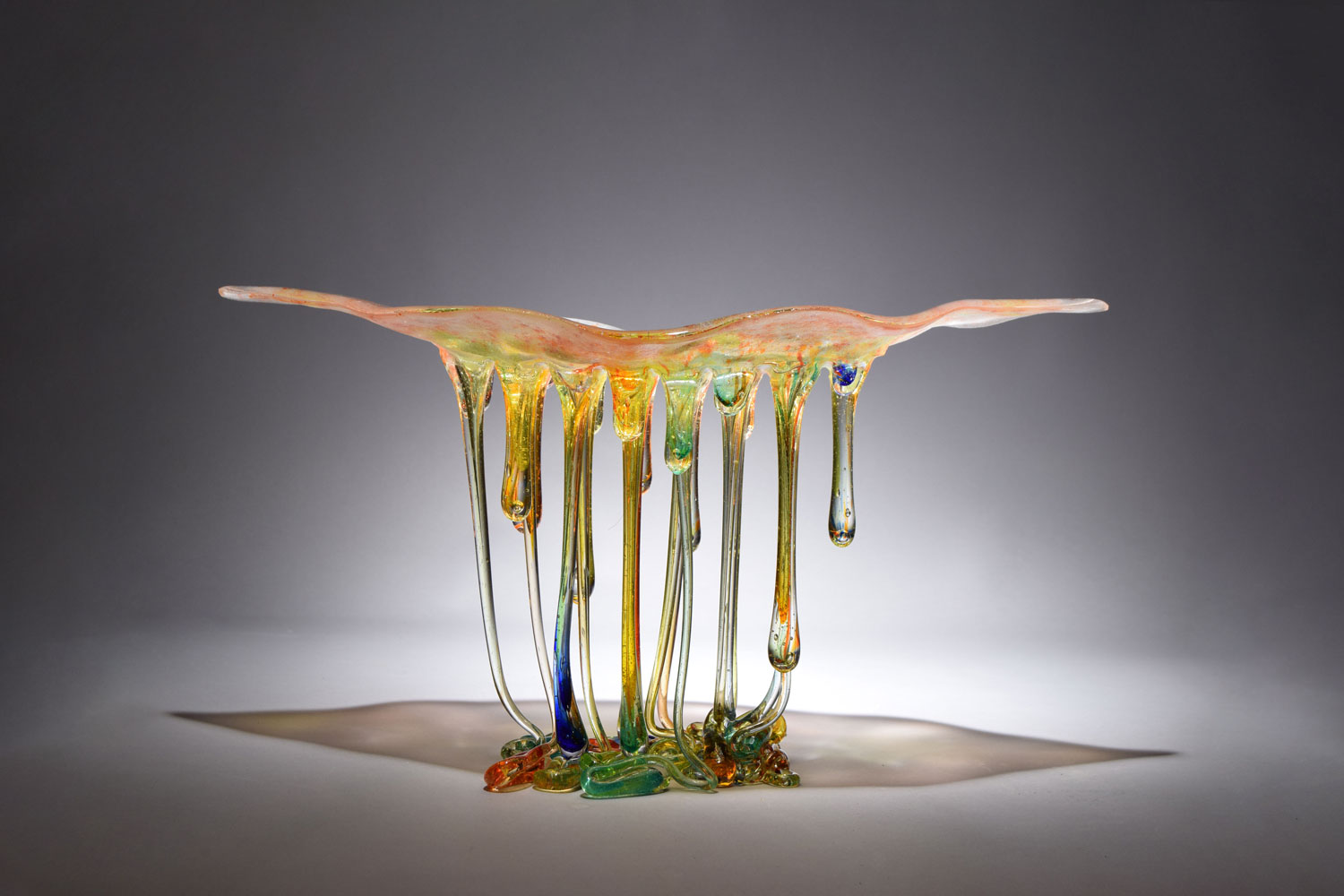 This sculpture, part of Daniela Forti's Meduse series, was entirely handmade using glass fusing techniques, where glass is exposed to temperatures so high that they alter its molecular process, changing its shape and creating a new form. The delicate, multi-coloured body of this jellyfish-like creature is sustained with glass filaments, representing its tentacles floating in water.