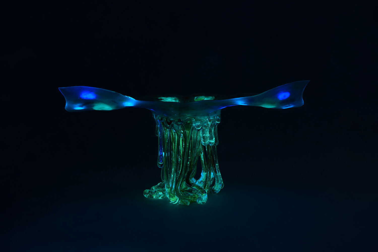 Photoluminescence is the property that some chemicals have to emit light when exposed to an external source such as sunlight or artificial light. In the dark or half-light conditions, these glass sculptural objects slowly releases the accumulated light and self-illuminate for many hours.