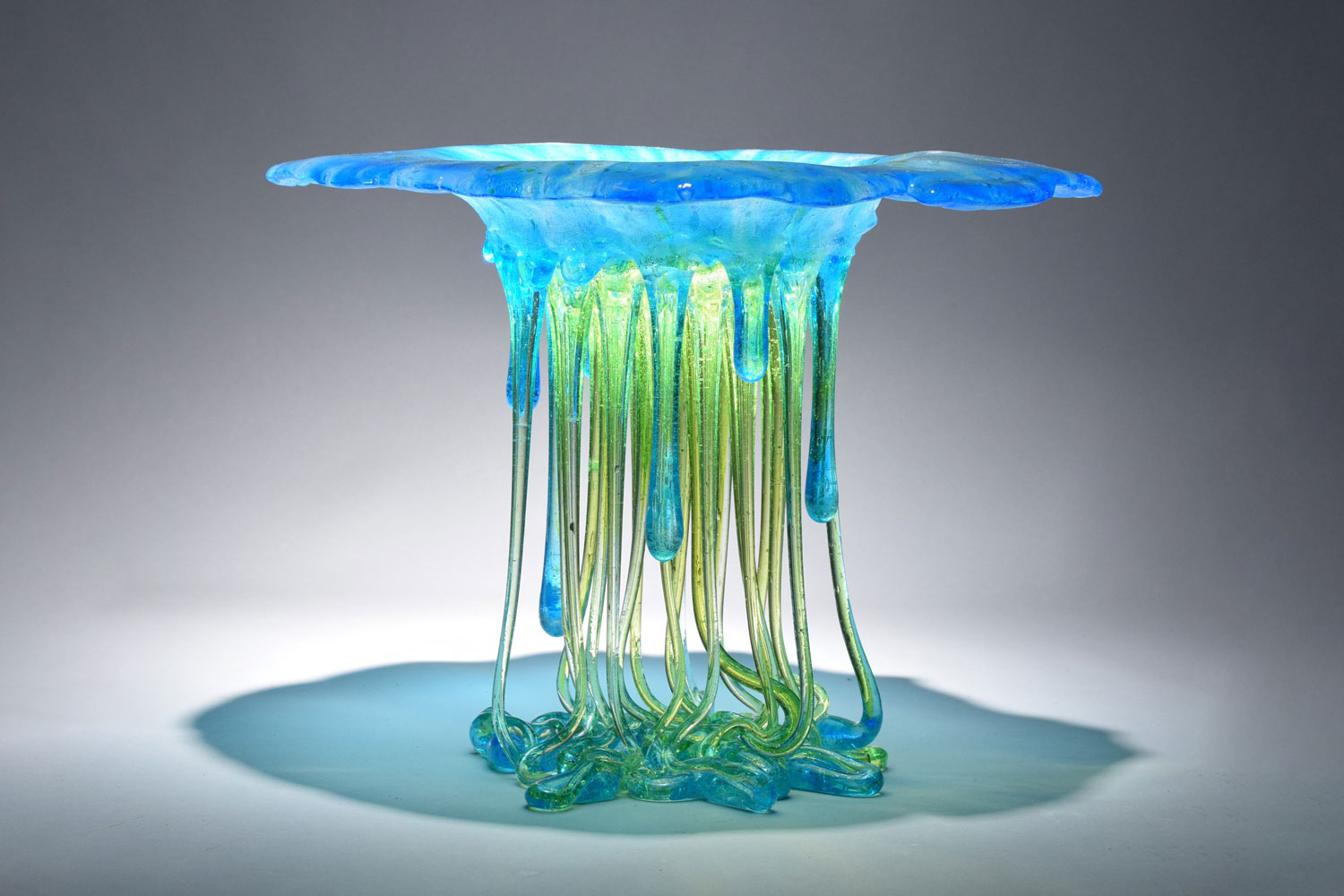 The iridescent silhouette of jellyfish inspired the mesmerising design of this sculpture, handcrafted from molten Murano glass. Sinuous filaments in yellow and turquoise descend from the flattened, blue-hued bell above, creating an astonishing drop-like effect.