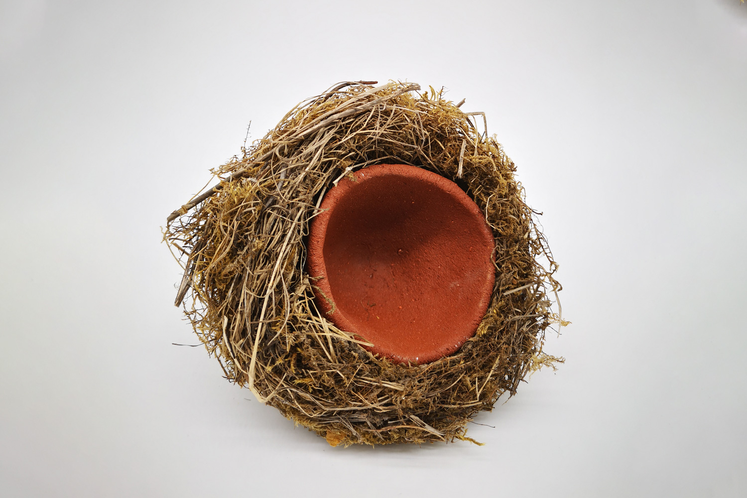 A found nest is lined with a ceramic bowl, filling the internal space of the nest. The bowl is made of locally sourced and refined ceramic material, pinched to create a simple bowl form. The texture of the soft clay and the pinching fingers are visible in the fired form which is a dark terracotta colour.