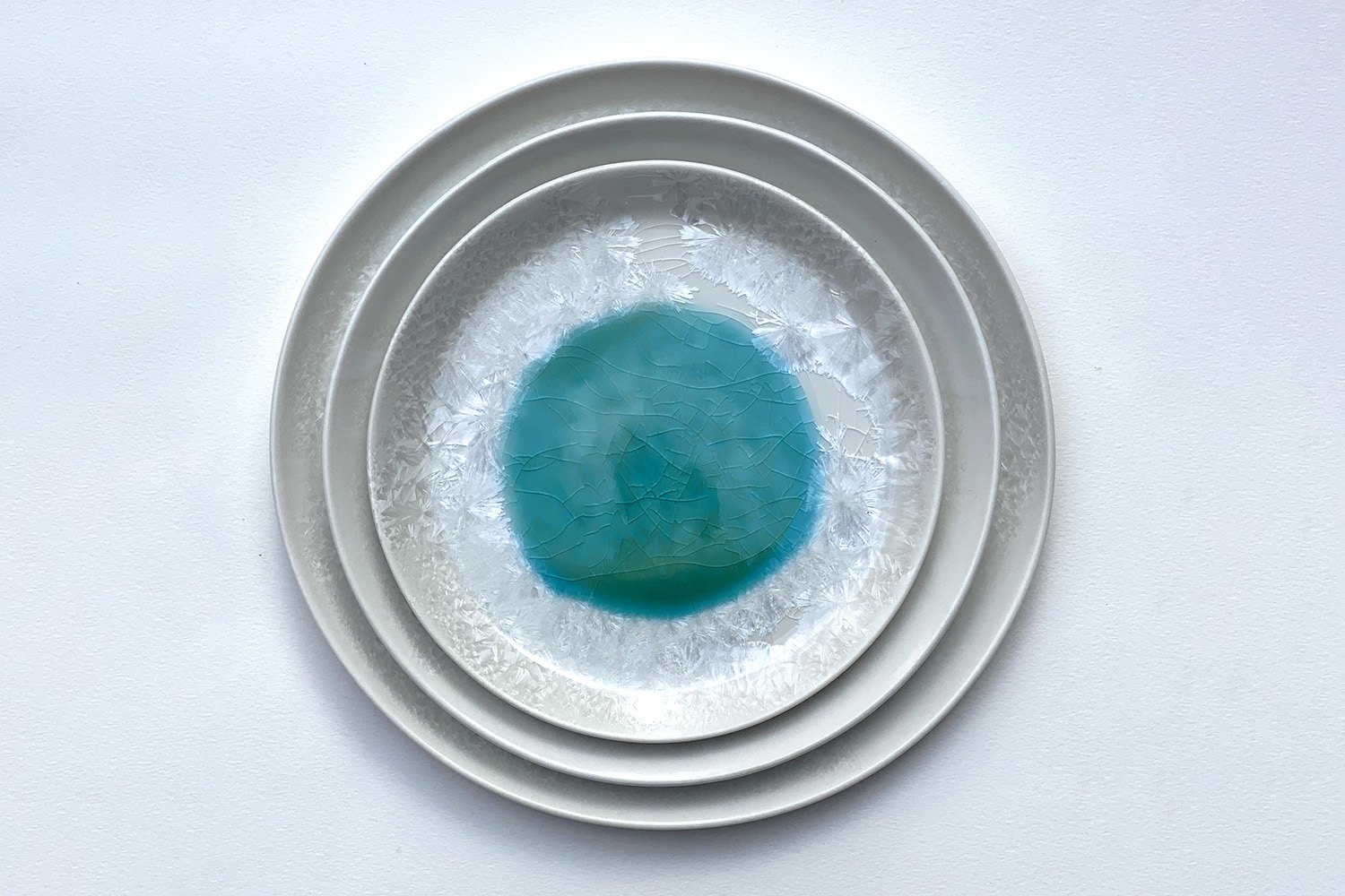 These three porcelain plates were thrown on the wheel. They have a green and crystallisation glaze, which are personal creations by Martine Mikaeloff. The two glazes are superimposed, to give depth. Martine Mikaeloff used a long firing process with several stages of cooling to make crystals appear.