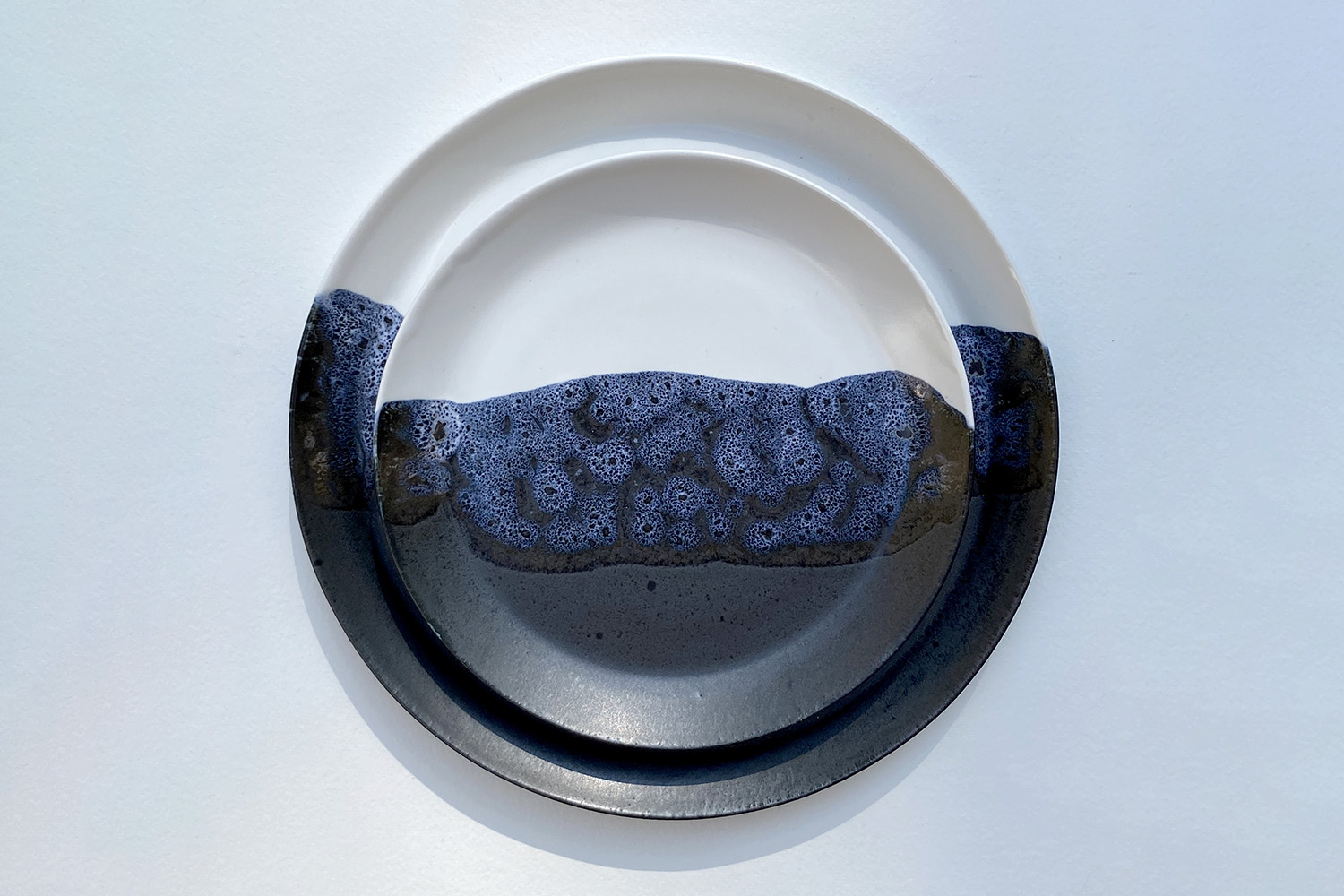 These two porcelain plates were thrown on the wheel. The overlaying of a white glaze on top of a black glaze gives the centre of the plates an unusual texture and mysterious bluish colour. This effect is the result of one of Martine Mikaeloff's long research projects.