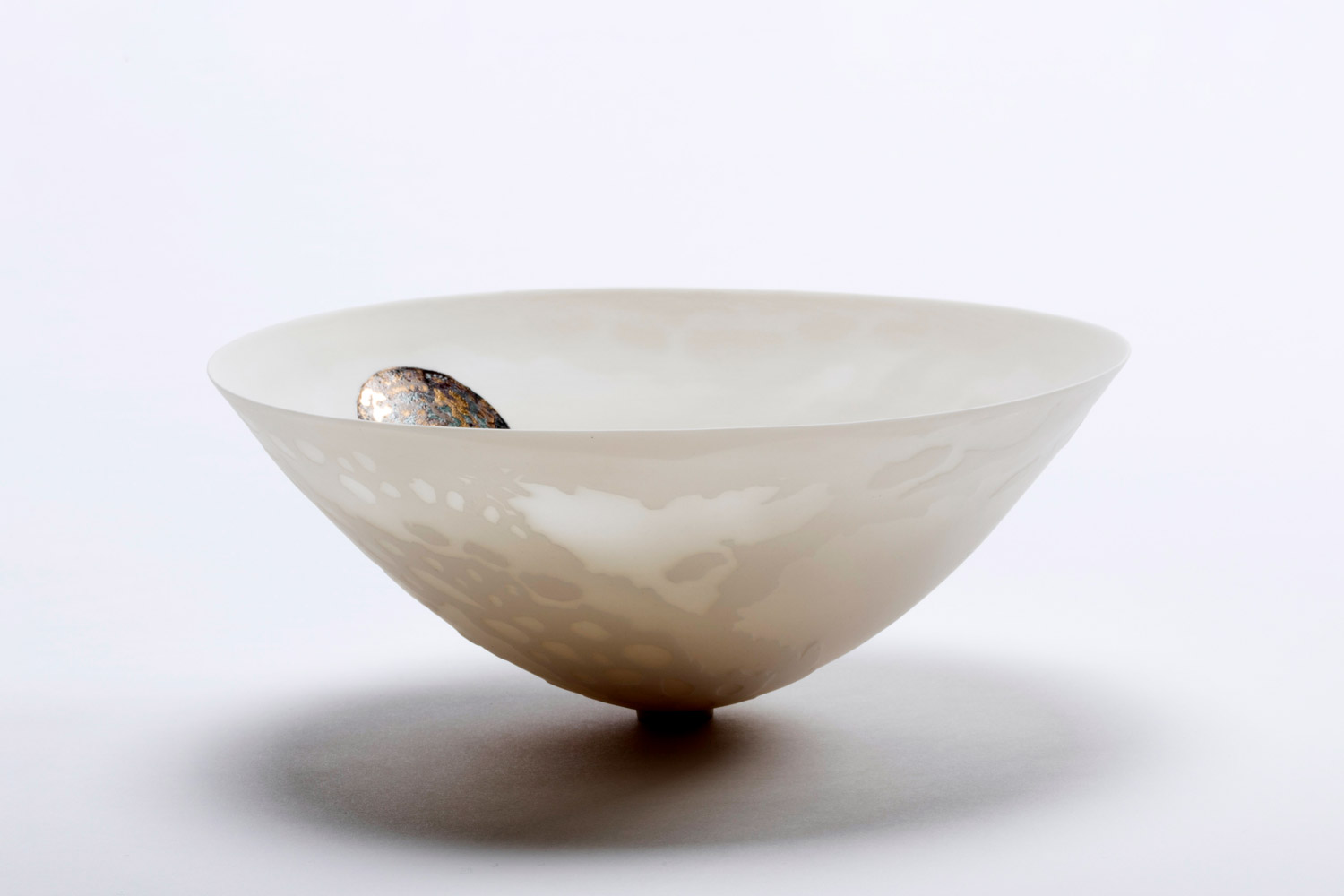 This thrown porcelain bowl is adorned with relief decoration and a silk screen transfer. Pots and dishes are familiar daily objects. By placing them in a new context and stripping them of their functionality, a dualistic feeling arises within the viewer of recognition and alienation.