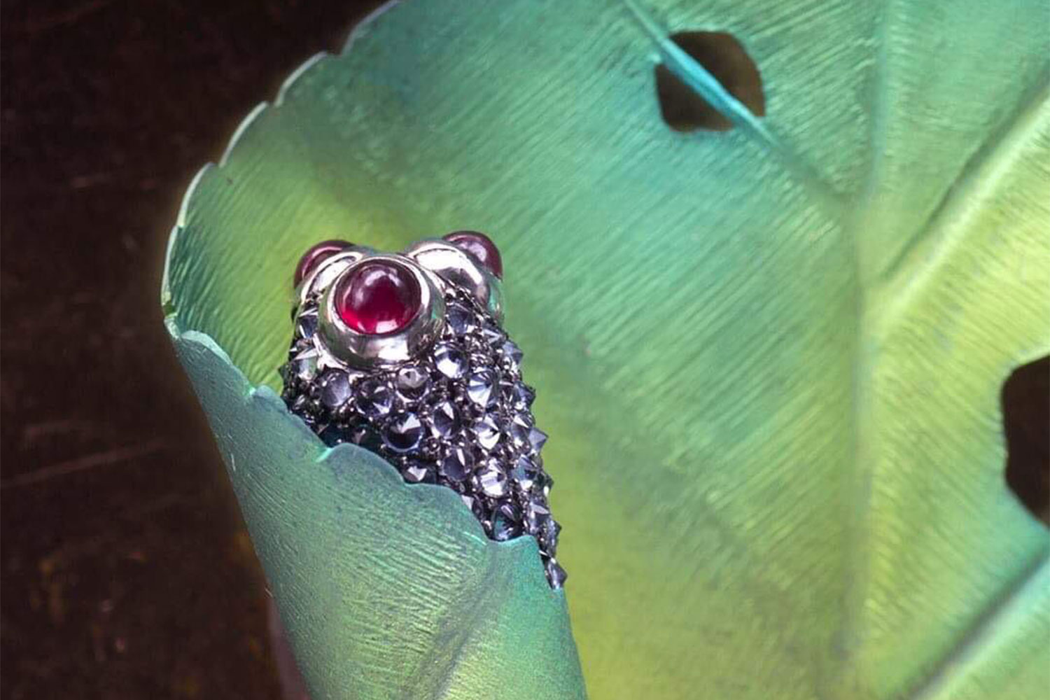 This titanium and gold brooch, fitted with sapphires and rubies, was based on the form of a caterpillar. The carefully placed sapphires mimic the body surface of a caterpillar, while three rubies make up its curious face.