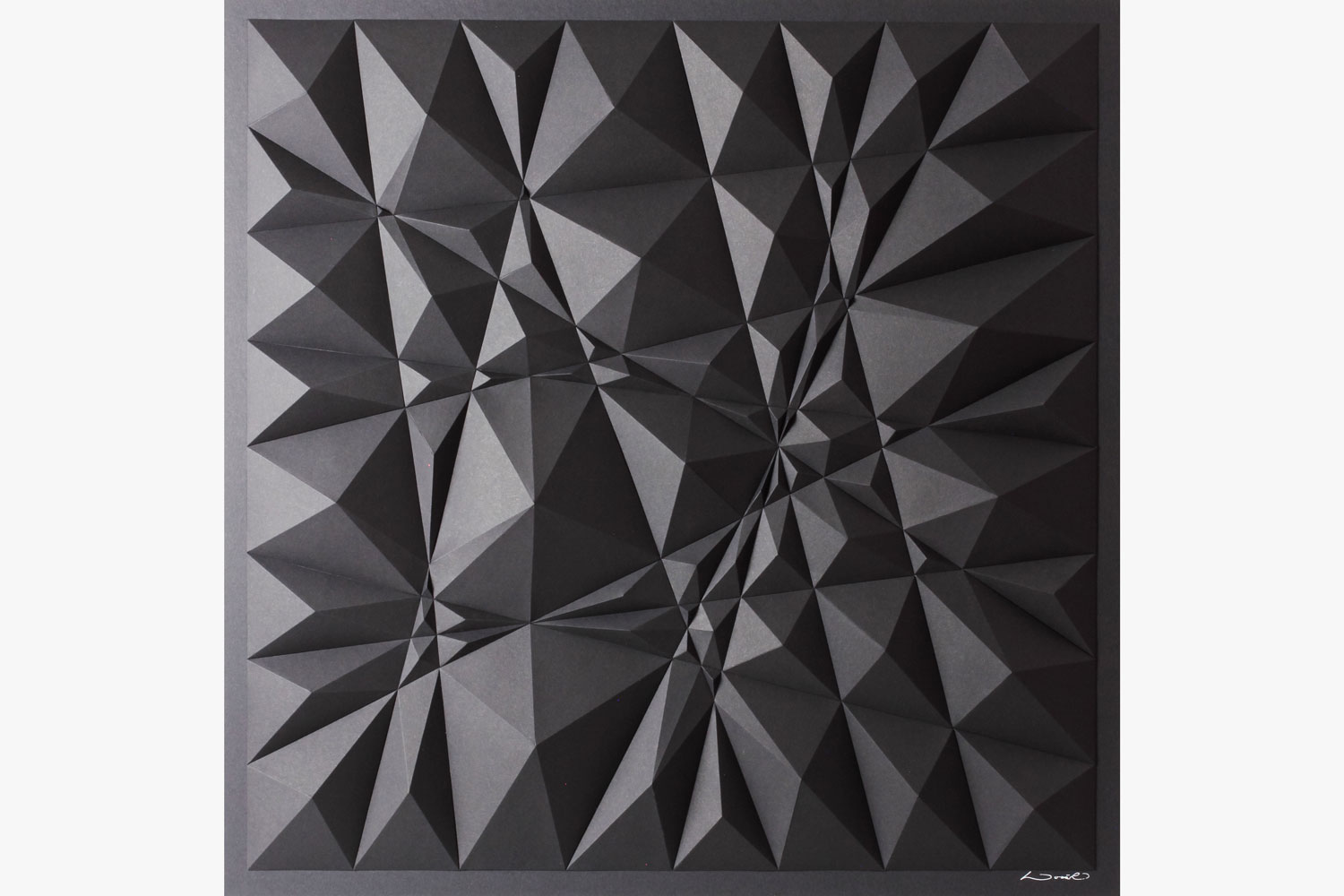 Kubo Novak switched his usual tiling method for a freer approach, a type of zig zag doodle drawn on a square grid. Kubo then took the drawing and used it as a foundation for this paper relief. The result is less pre-calculated and more intuitive compared to his other series.