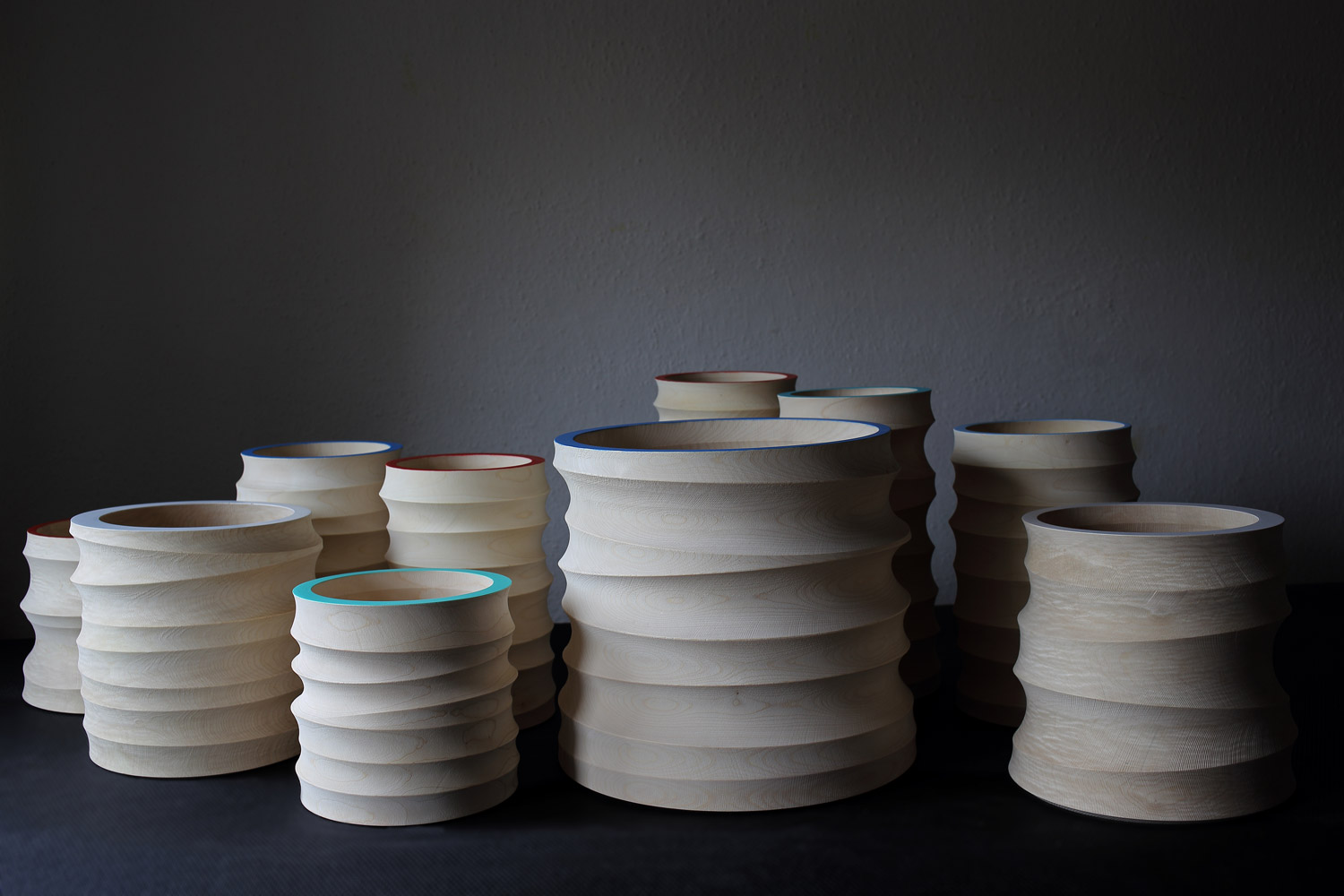 These maple wood structure and microstructure turned cylinders were achieved on a milling engine of Tibor's own construction. The vessels have been milled both outside and inside.