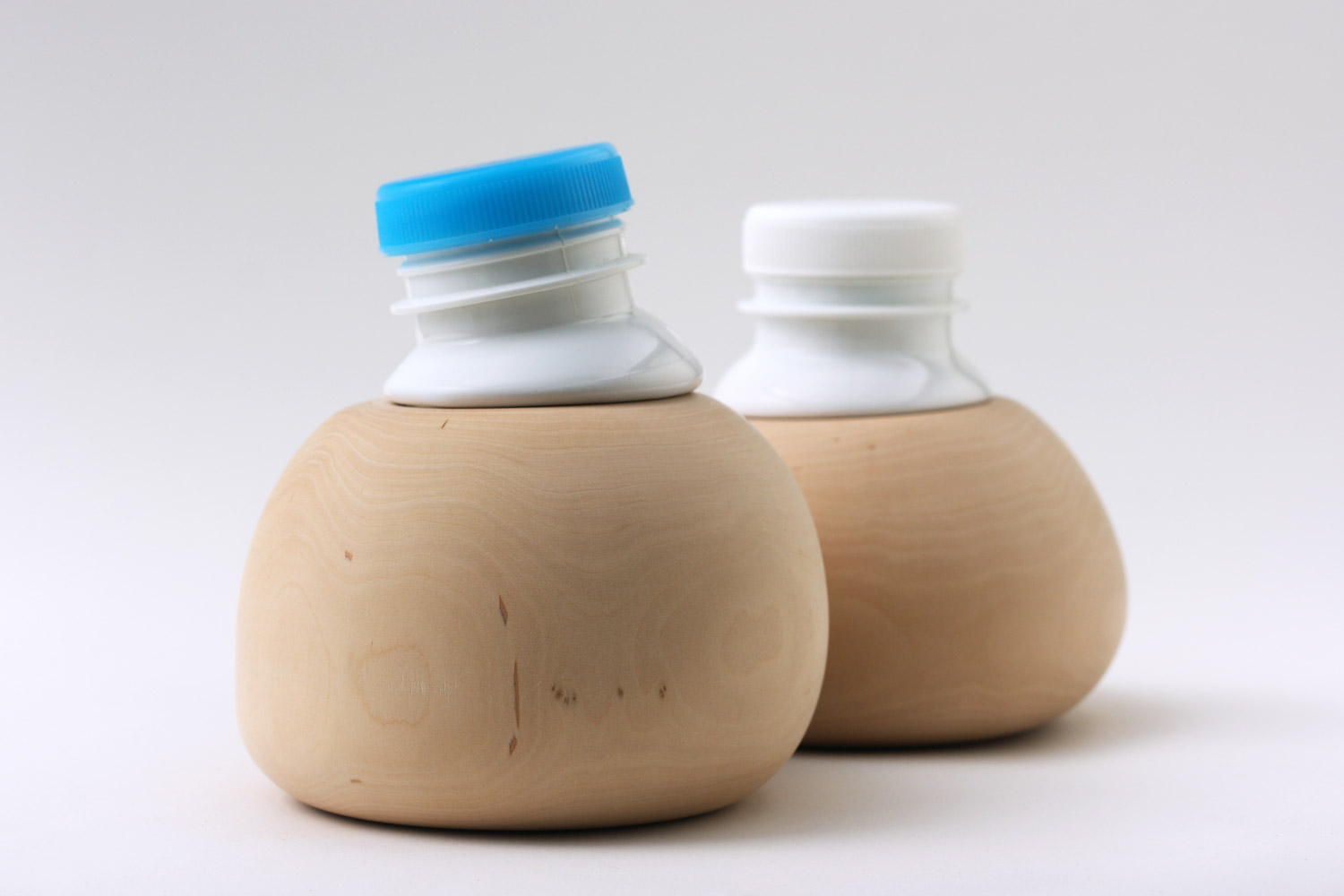 The thermoplastic PET Pots were designed for hot tea and spice storage. The bottle shrinks when heated and the plastic wraps tightly to the shape. The body was achieved with eccentric woodturning.