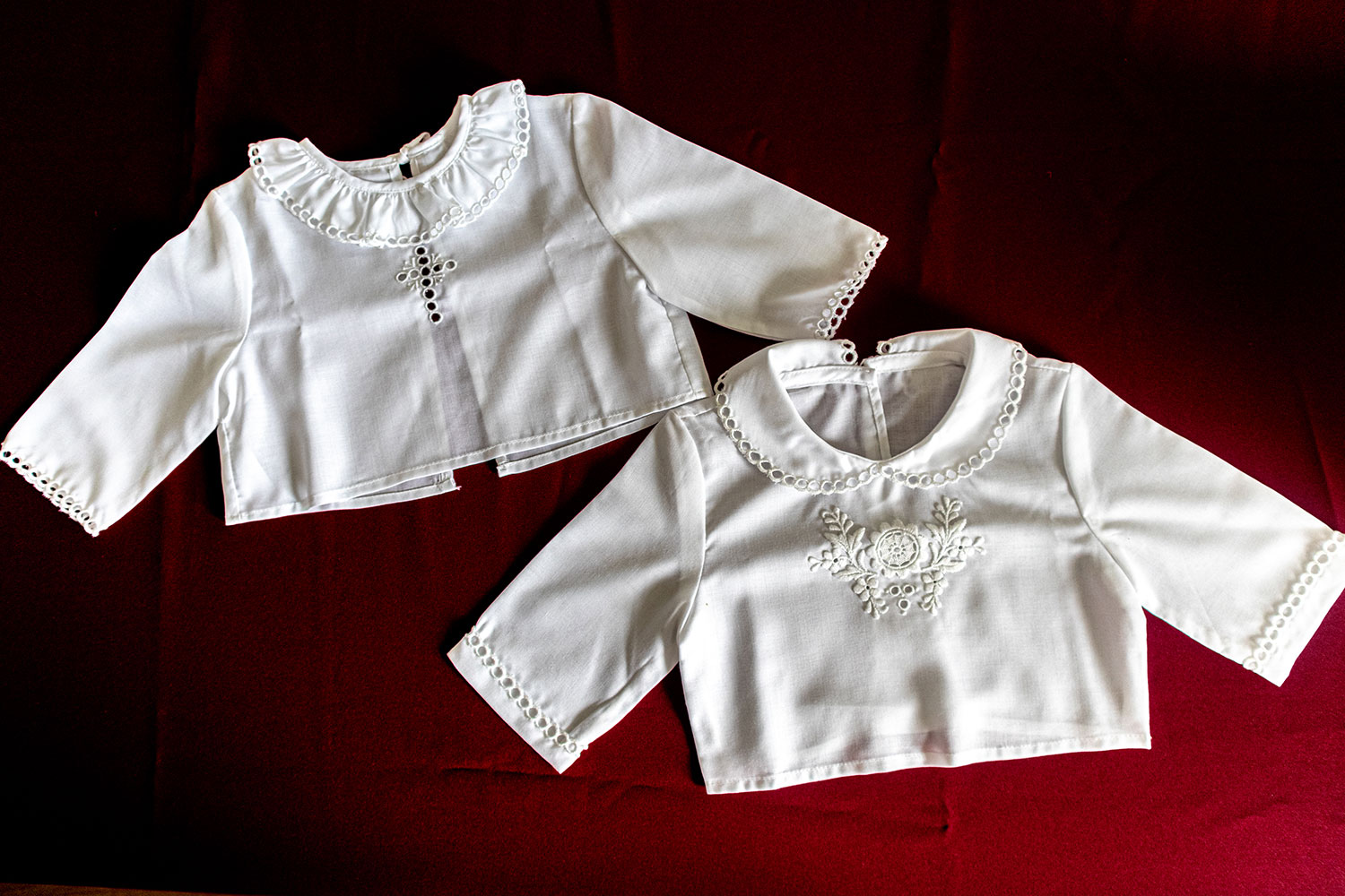 These white poplin tops, intended for a new-born child's baptism, are decorated with intricate white embroidered patterns. Ágnes Kovácsné perpetuates a unique embroidery technique passed down in her village over generations.
