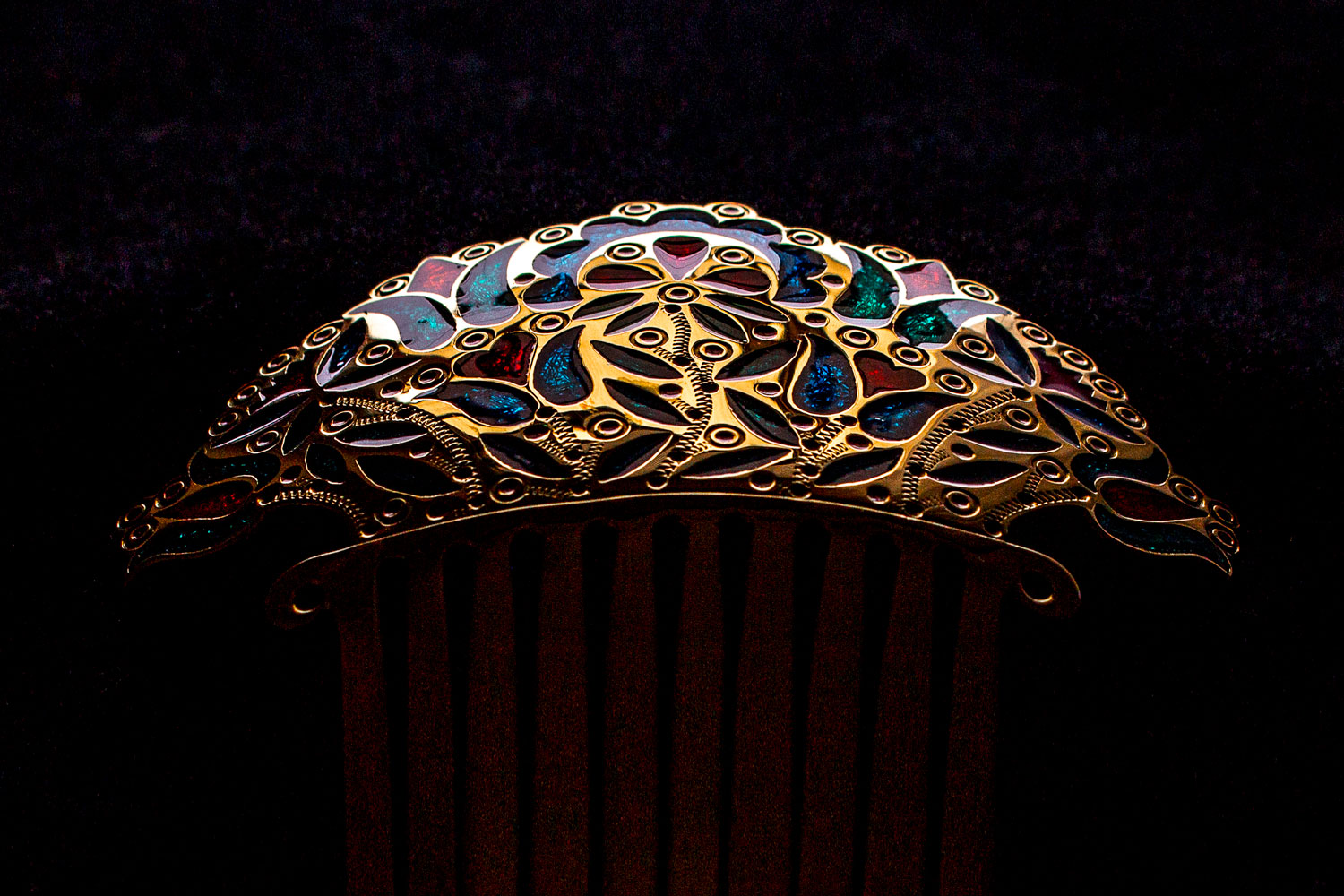 This hair comb was inspired by the tradition of wearing combs in the region of Horná Orava in central Slovakia. It is also based on traditional folk embroidery. Plant folk patterns were transferred into metal through metalworking techniques. The plastic inlay technique is complemented by engraved and embossed decoration.