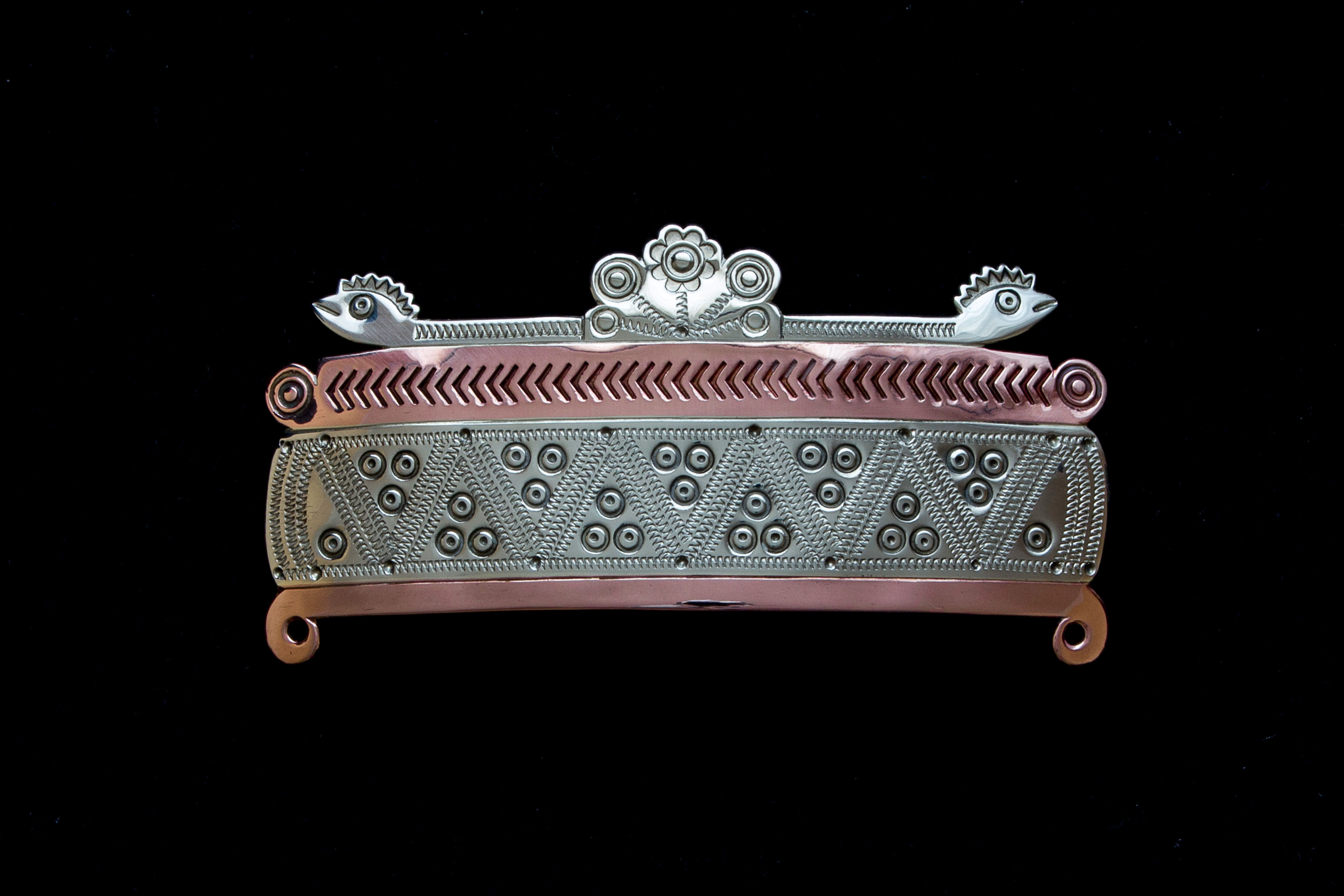 This stylized alpaca and copper brooch is based on folk jewellery from the Slovak village of Kokava nad Rimavicou. The snake depicted on the brooch is a protective symbol that often appeared in Slovak Wallachian culture. Engraving and embossing decorative techniques were used to achieve the adornments.