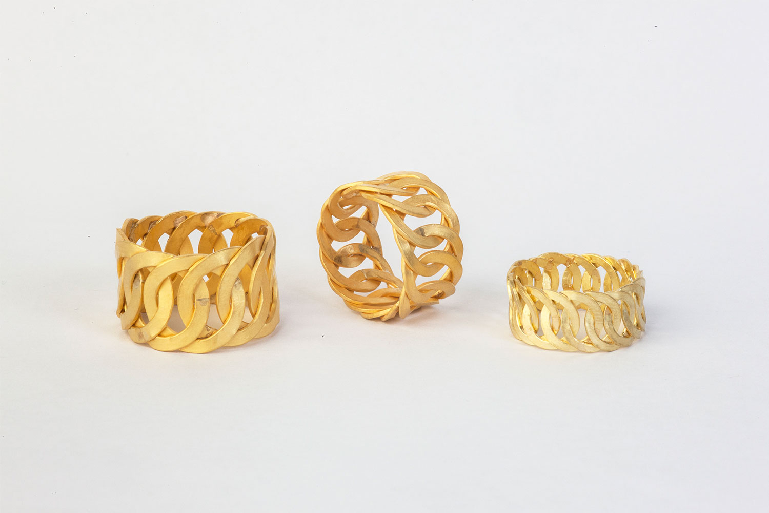The Fishbone rings feature hammer flattened links, soldered together to make a wide ring.